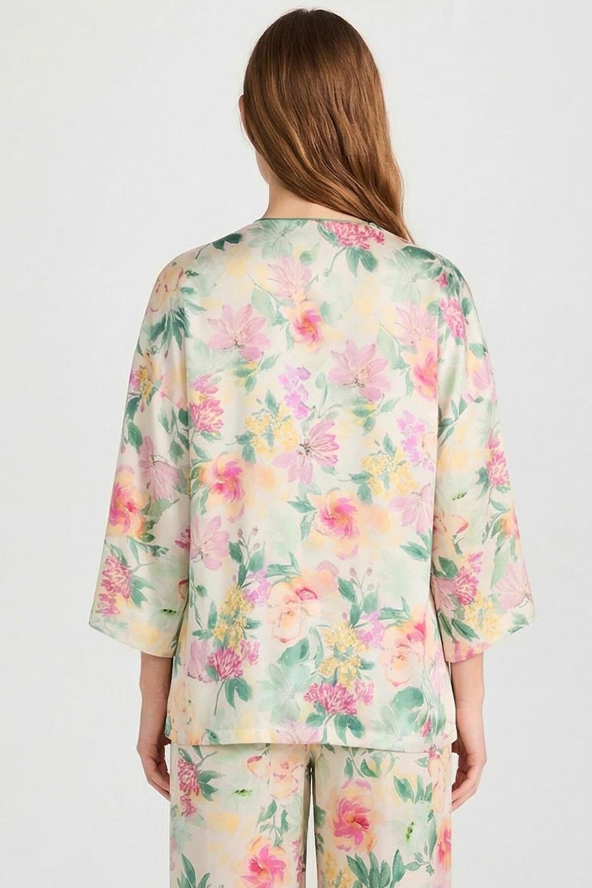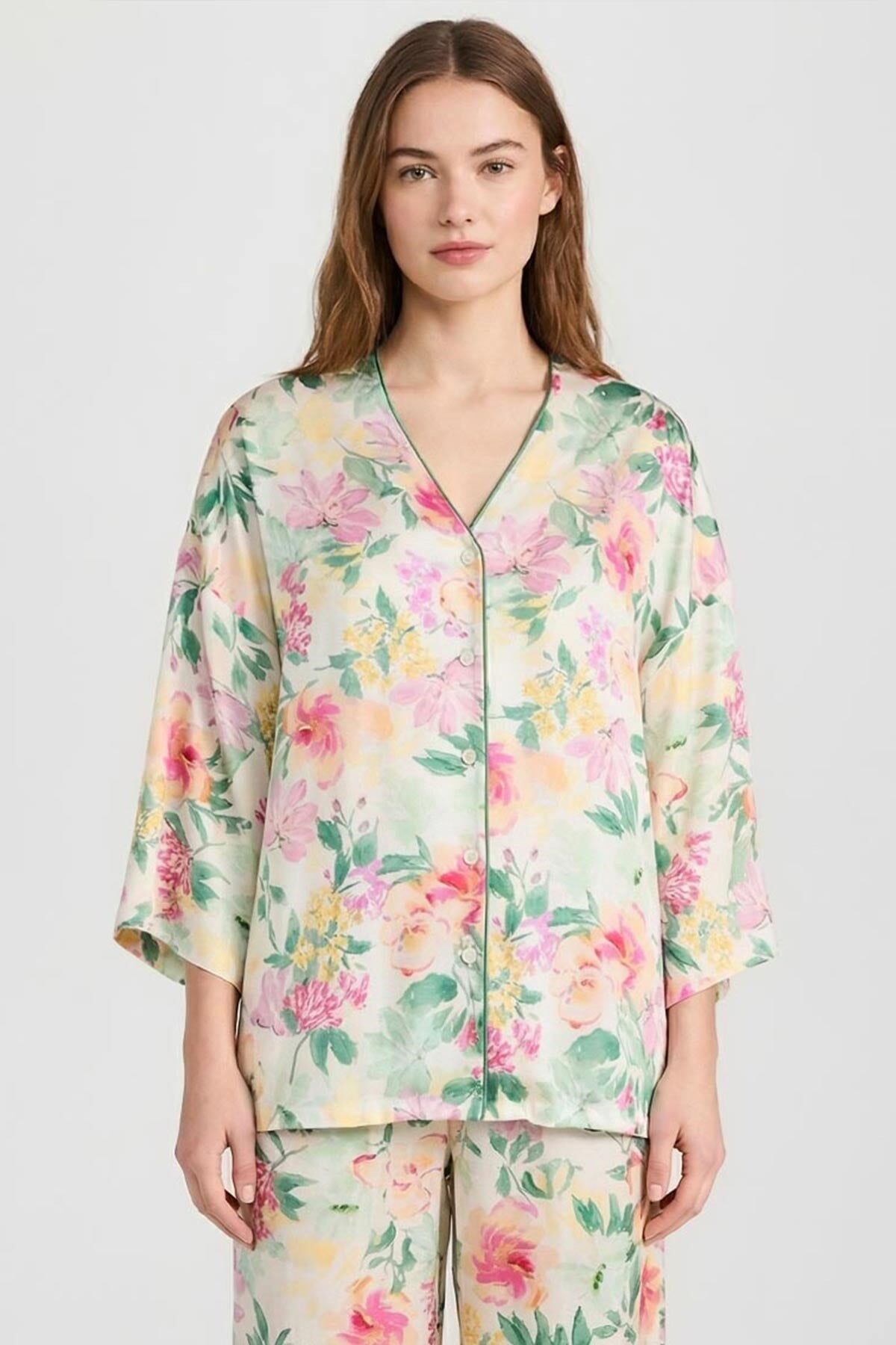 %100 viskon dokuma kumaştan üretilen uzun kollu yakasız gömlek pijama üstü, hafif, yumuşak ve nefes alabilen yapısıyla konforu ön planda tutar. Akıcı dokusu sayesinde hem ev giyiminde hem de uyku sırasında rahat kullanım sunar.