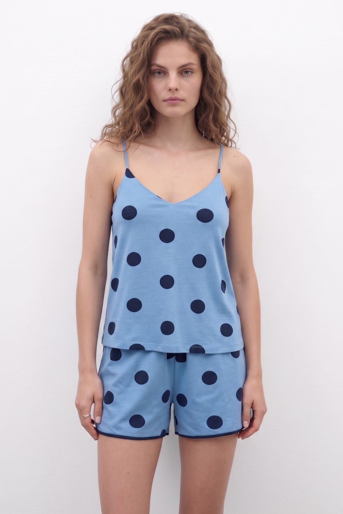 Puantiyeli tasarımı sayesinde şık, zarif ve sevimli bir görünüm sunan bu kadın pijama takımı, konfor ile estetiği bir araya getirir. Günlük kullanımda rahatlıkla tercih edilebileceği gibi, uyku giyiminde de hafif ve konforlu yapısıyla öne çıkar.
