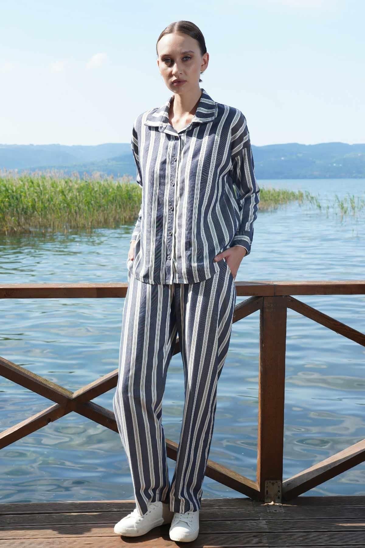 Mısırlı Kadın Viskon Çizgi Desenli Gömlek Takım