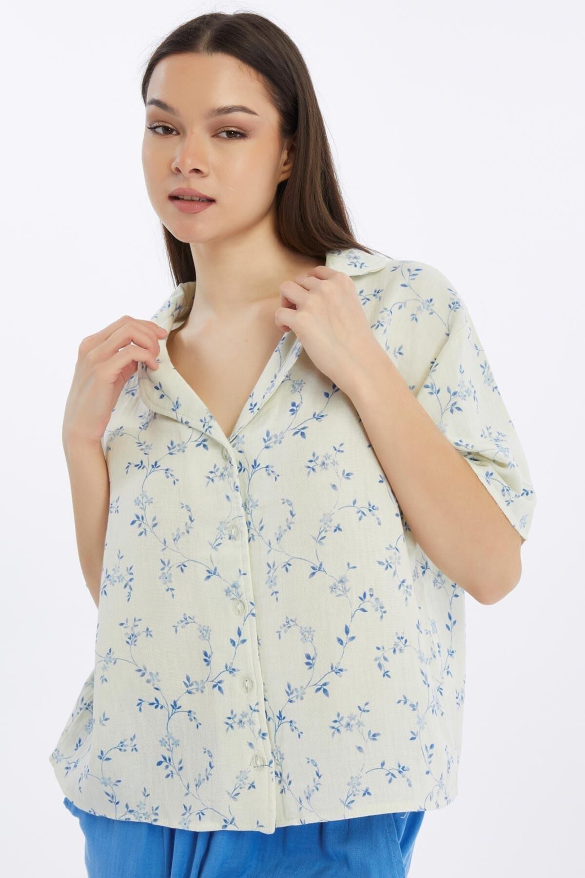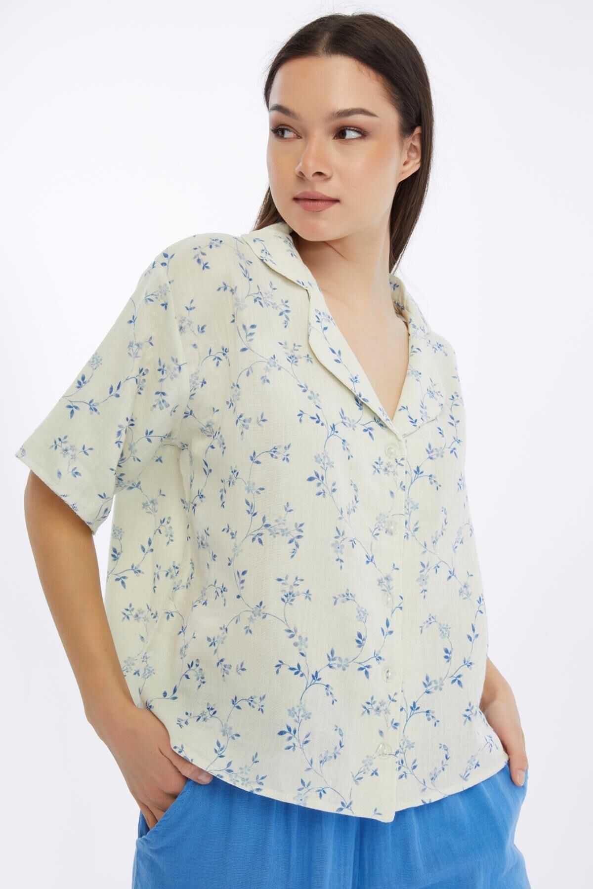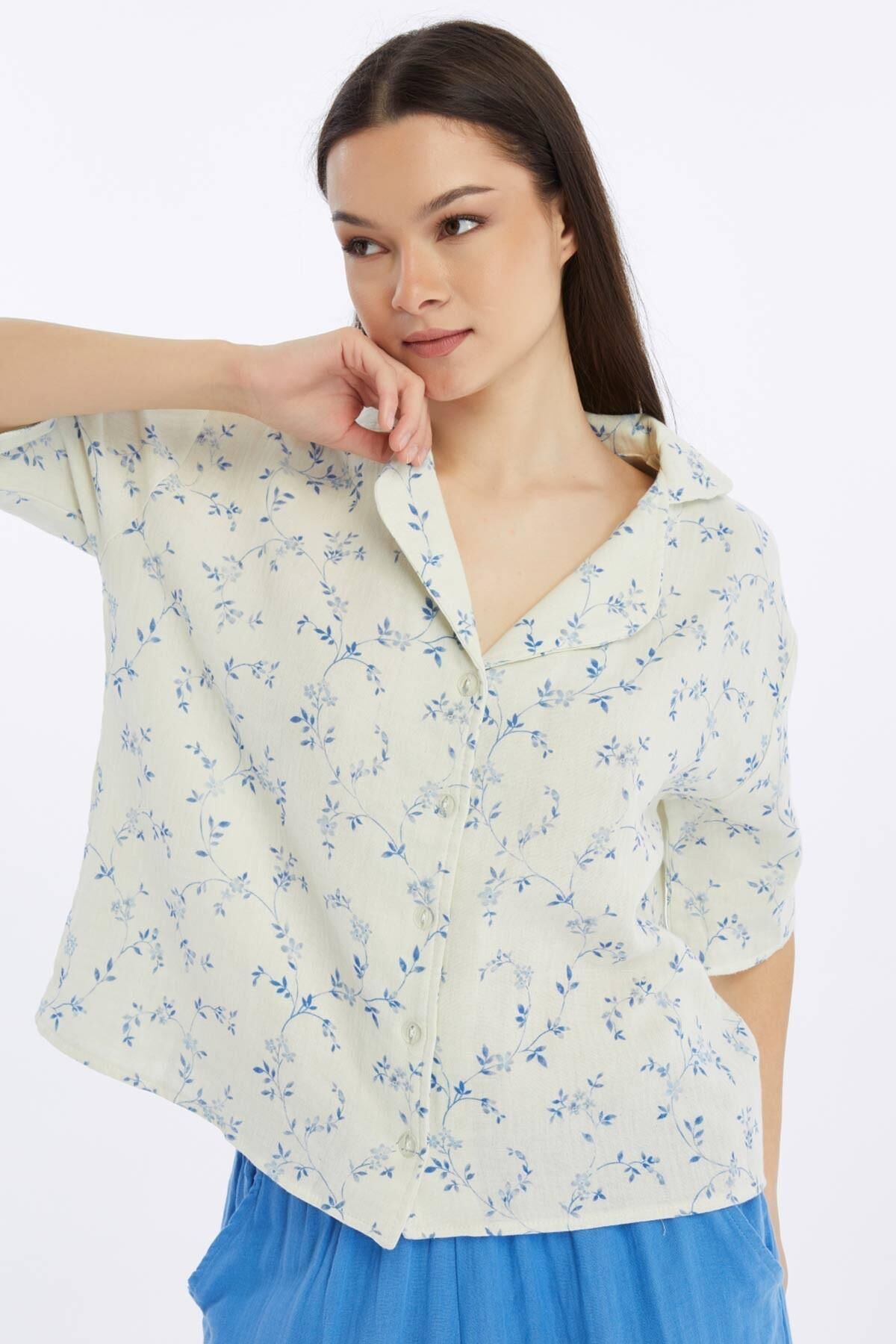 Mısırlı MÜSLİN Çiçekli Gömlek Mavi