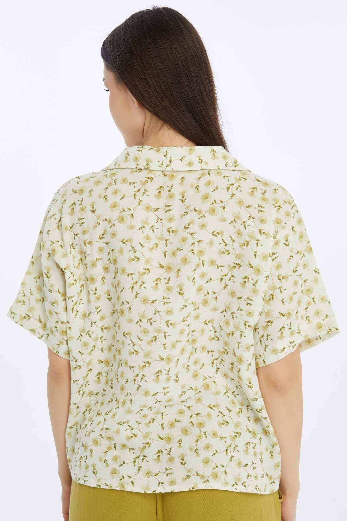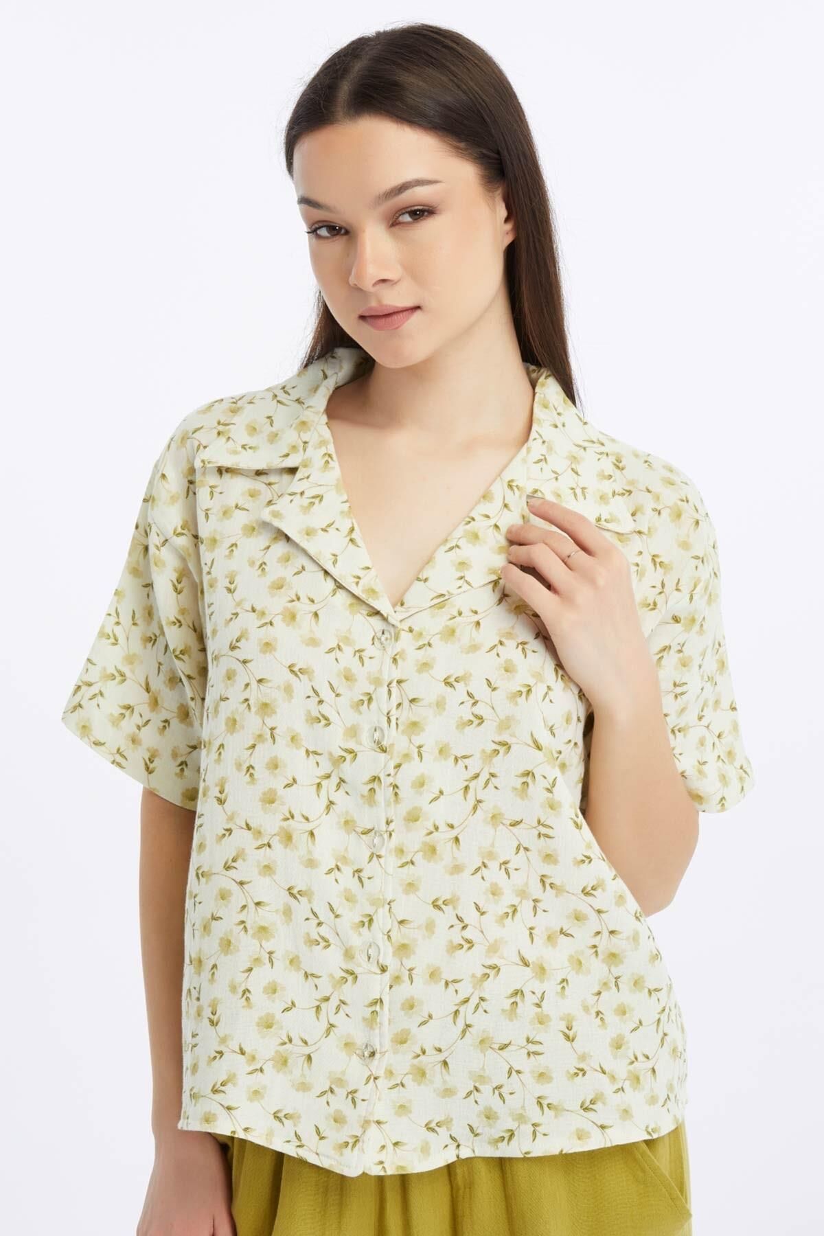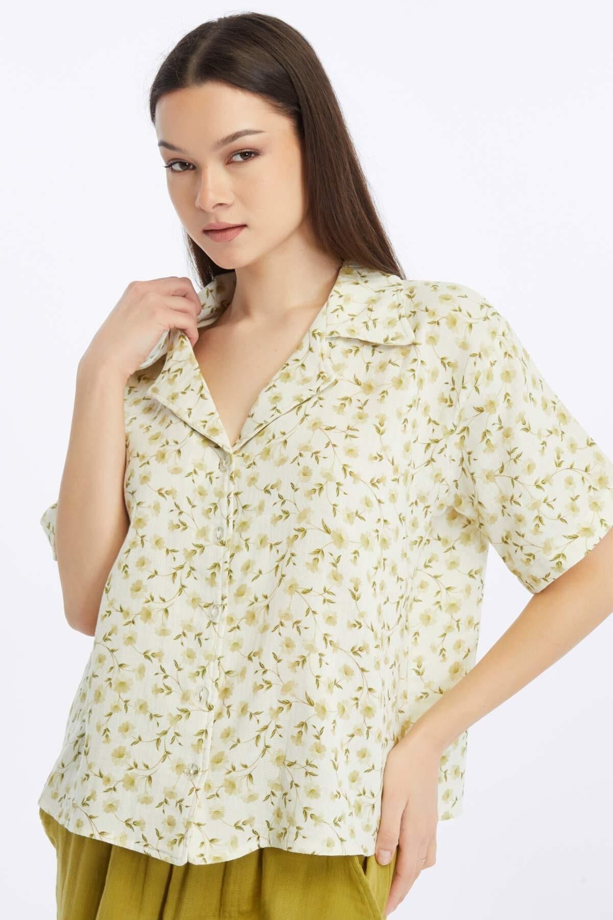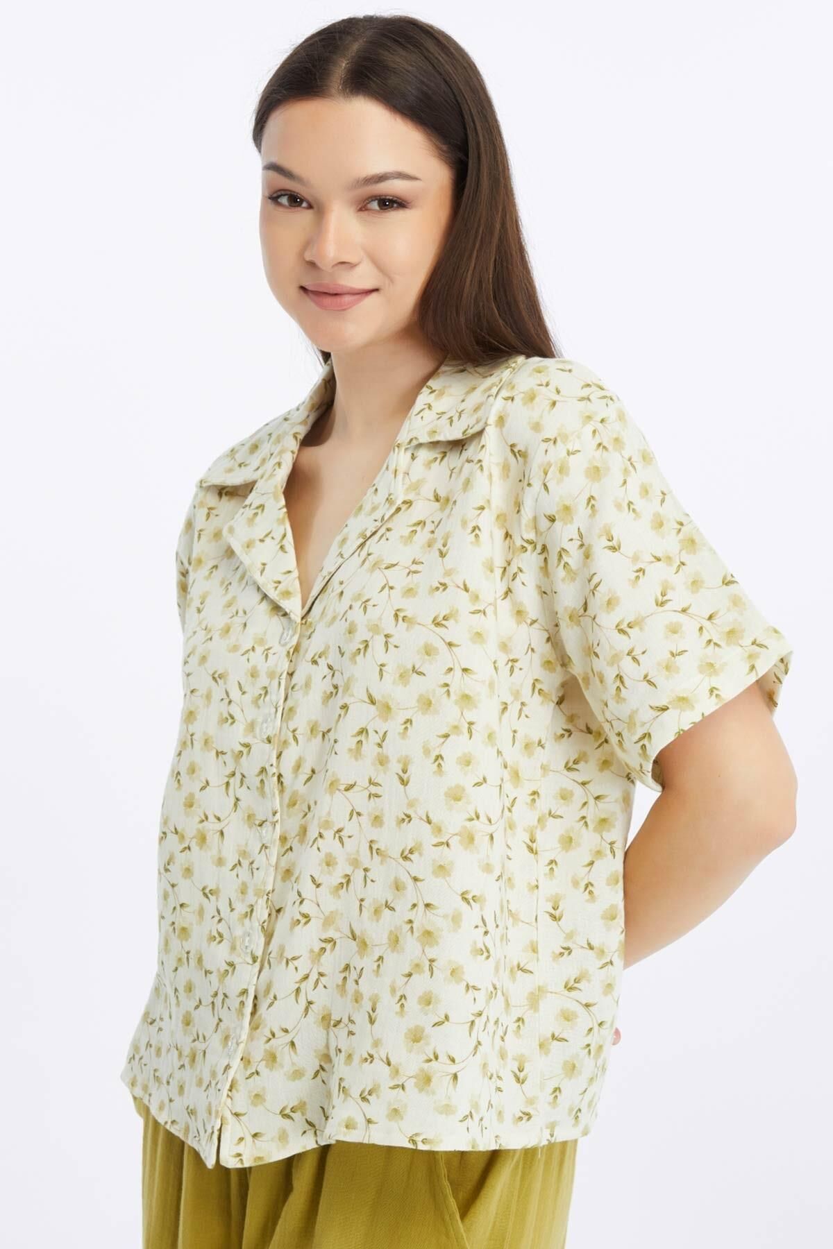 Mısırlı MÜSLİN Pamuklu Çiçekli Gömlek Yeşil