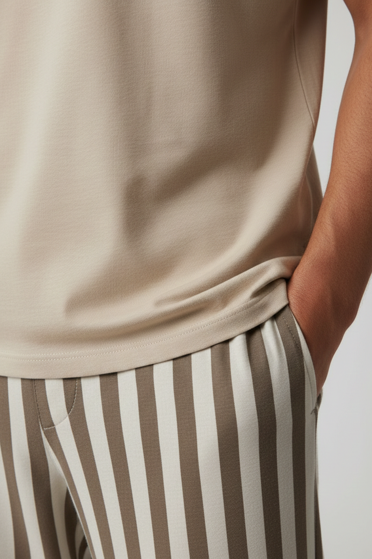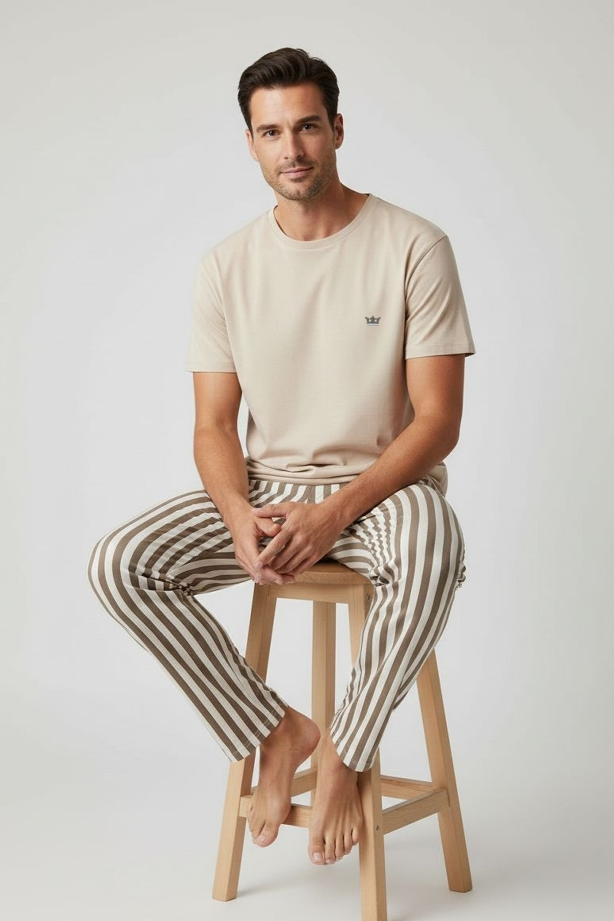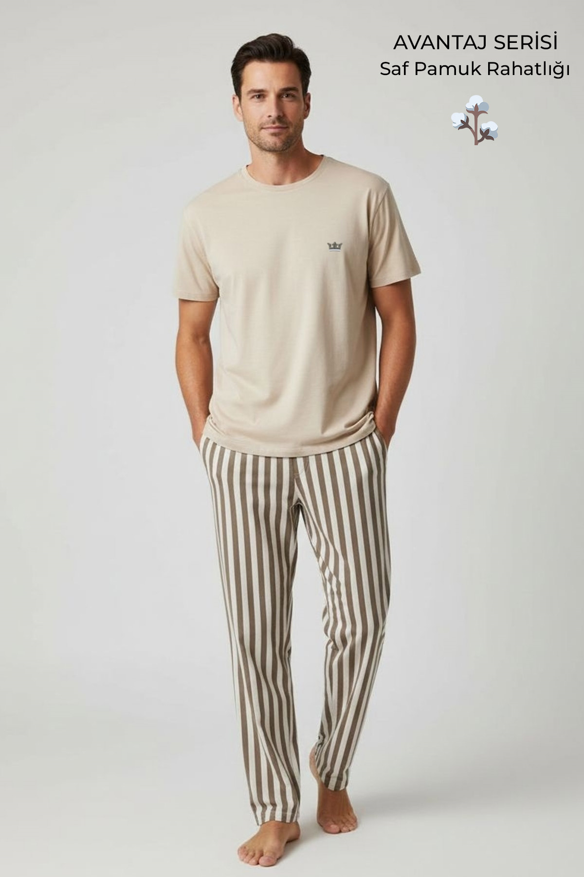 Pamuklu Kısa Kollu Pijama Takım Bej-Kahverengi