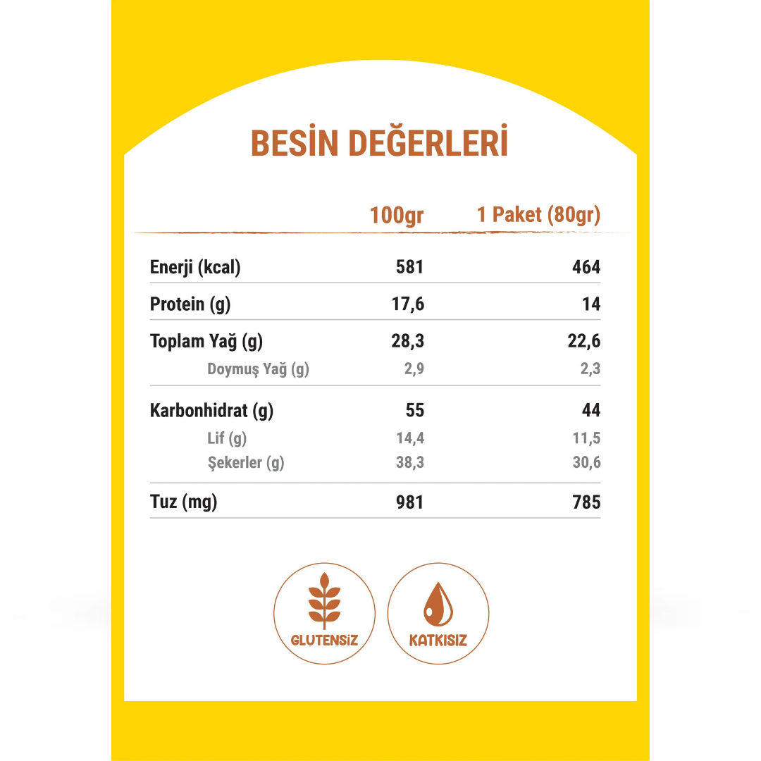 Besin Değerleri 100 gr 1 Paket (80 gr) Enerji (kcal) 581 464 Protein (g) 17,6 14 Toplam Yağ (g) 28,3 22,6 Doymuş Yağ (g) 2,9 2,3 Karbonhidrat (g) 55 44 Lif (g) 14,4 11,5 Şekerler (g) 38,3 30,6 Tuz (mg) 981 785İçindekiler : Yer fıstığı, Hurma ezmesi, Çikolata parçacıkları (%10) (Şeker, bitkisel yağ (tam hidrojenize palm), peyniraltı suyu tozu, kalsiyum karbonat, kakao tozu, emülgatör (ayçiçek lesitini), aroma verici (çikolata)), Nohut unu, Deniz Tuzu.