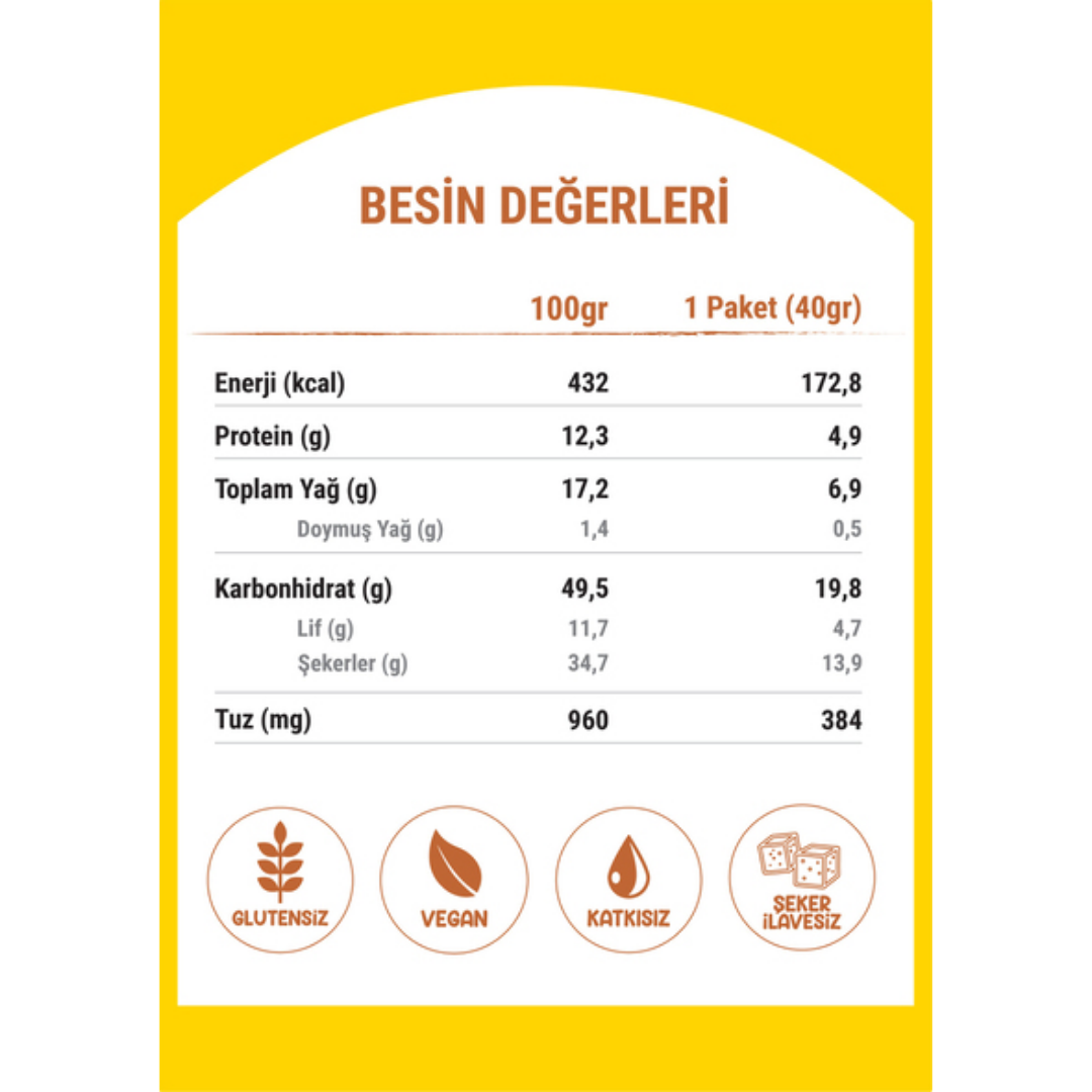 Besin Değeri 100g 1 Paket (40g) Enerji (kcal) 432 172,8 Protein (g) 12,3 4,9 Toplam Yağ (g) 17,2 6,9 - Doymuş Yağ (g) 1,4 0,5 Karbonhidrat (g) 49,5 19,8 - Lif (g) 11,7 4,7 - Şekerler (g) 34,7 13,9 Tuz (mg) 960 384