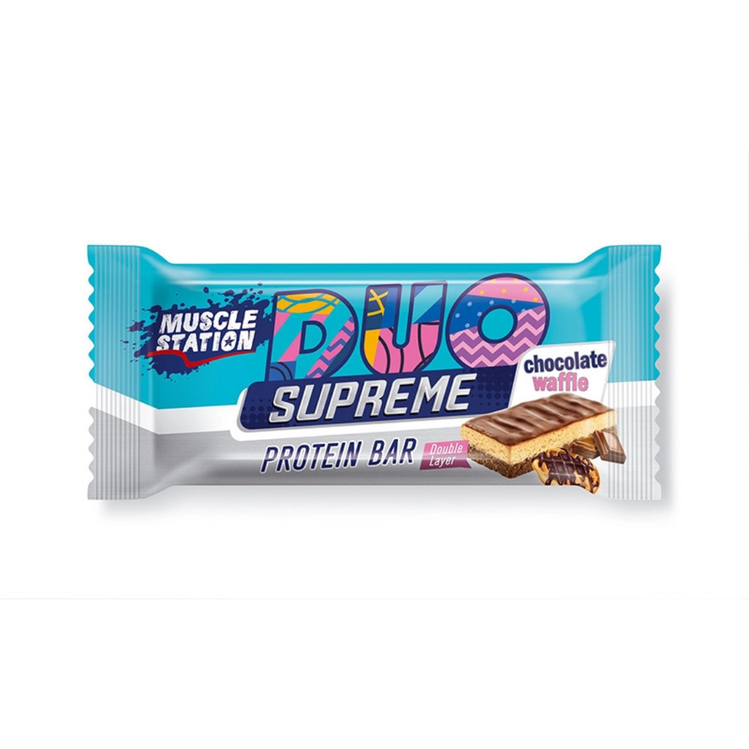 Muscle Station Duo Supreme Protein Bar; çift katlı yapısı ile öne çıkar. Keyifli ve lezzetli bir tüketim sunan protein bar, her bir paketinde 7 gram protein desteği sunar. Bunların yanı sıra Muscle Station Duo Supreme, sadece 160 kaloriden oluşur. Karamel & yer fıstığı, çikolata & waffle ve portakal & bitter çikolata aromaları ile zengin lezzet çeşitliliğine sahiptir.
