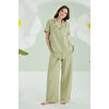 Kısa kollu, düğmeli üst tasarımı klasik ve zamansız bir görünüm sunarken, rahat kesim alt parçası hareket özgürlüğünü destekler. Mavi rengi ile sade ve şık bir stil sunan bu takım, hem uyku hem de günlük ev giyimi için ideal bir seçenektir.