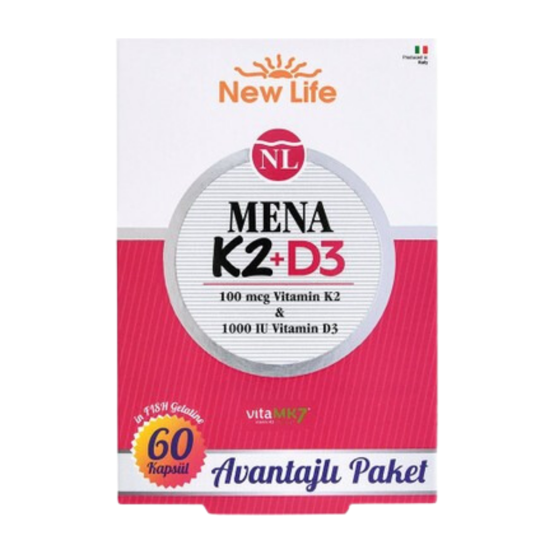 New Life Mena Vitamin K2 + D3, K2 vitamininin efektif formu olan MK-7 (Menakinon-7) ile D3 vitaminini bir arada sunan bir gıda takviyesidir. İçeriğindeki bileşenler kalp damar hastalıklarını engellemeden bağışıklık sistemine kadar genel vücut sağlığında önemli rol oynarlar. New Life Mena K2 + D3 60 Kapsül ürününe benzer en iyi D vitamini takviyesi fiyatlarını görmek için inceleyin ve karşılaştırın. New Life Mena K2 + D3 60 Kapsül ürününün, günde 1 kapsül tok karnına kullanılması önerilmektedir.
