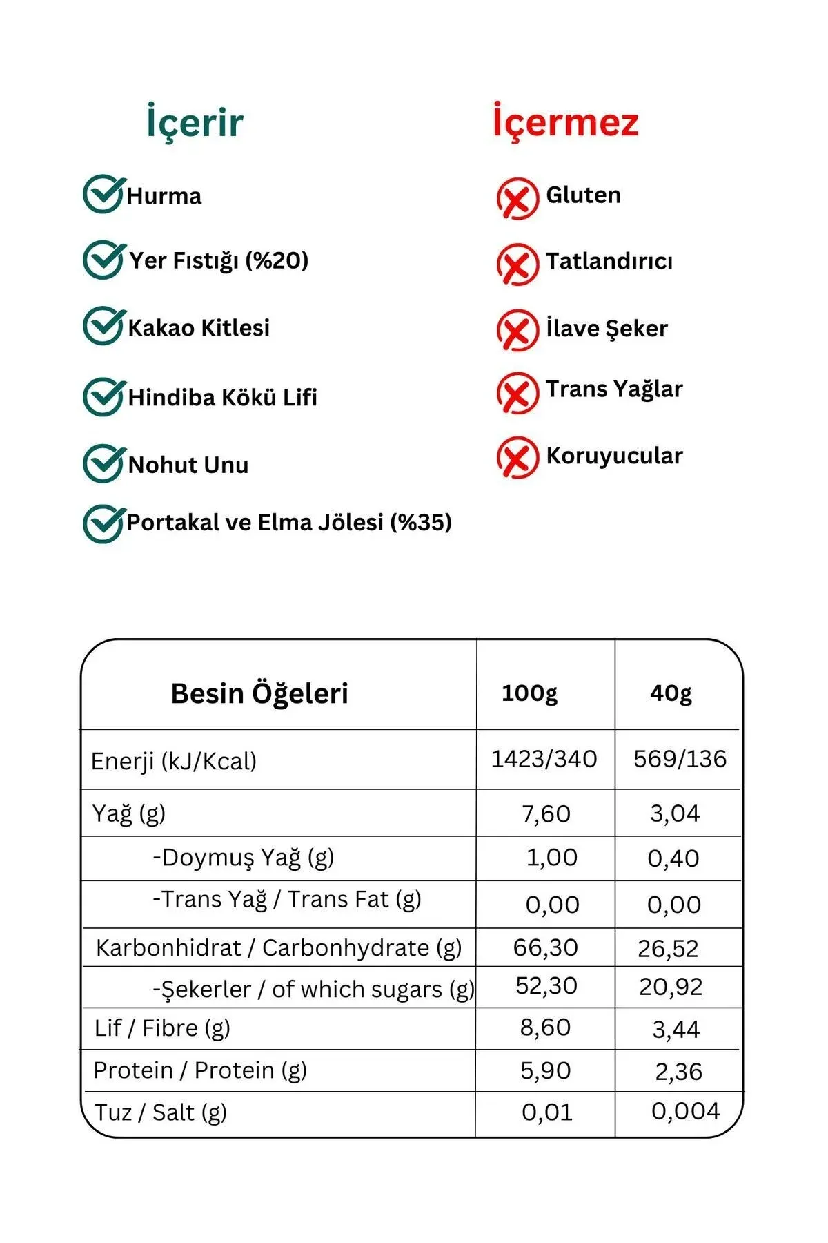 İçindekiler: %65 Meyve Bar (Hurma, Yer Fıstığı (%20), Kakao Kitlesi, Hindiba Kökü Lifi, Nohut Unu), %35 Portakal ve Elma Jölesi (Elma Suyu Konsantresi (%87), Portakal Suyu Konsantresi (%5), Elma Püresi Konsantresi (%4), Lif (Narenciye), Kıvam Arttırıcı (Pektin), Asitlik Düzenleyici (Sitrik Asit), Aroma Verici (Portakal)).; ; Alerjen Uyarısı: Yer fıstığı içerir.; Süt ürünleri, fındık, Antep fıstığı, badem, ceviz ve kaju fıstığı içerebilir.; ; Vegan, Glutensiz, Yüksek Lif, Hurma ile Tatlandırılmıştır.; ; Ürünlerimizin hiçbirinde domuz yağı ve katkıları yoktur.