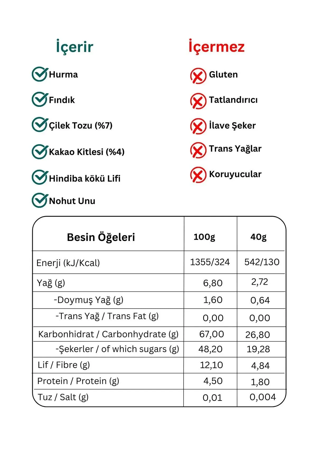 İçindekiler: Hurma, Fındık, Çilek Tozu (7%), Kakao Kitlesi (%4), Hindiba Kökü Lifi, Nohut Unu.; ; Alerjen Uyarısı: Fındık içerir.; Süt ürünleri, yer fıstığı, Antep fıstığı, badem, ceviz ve kaju fıstığı içerebilir.; ; Vegan, Glutensiz, Yüksek Lif, Hurma ile Tatlandırılmıştır.; ; Ürünlerimizin hiçbirinde domuz yağı ve katkıları yoktur.