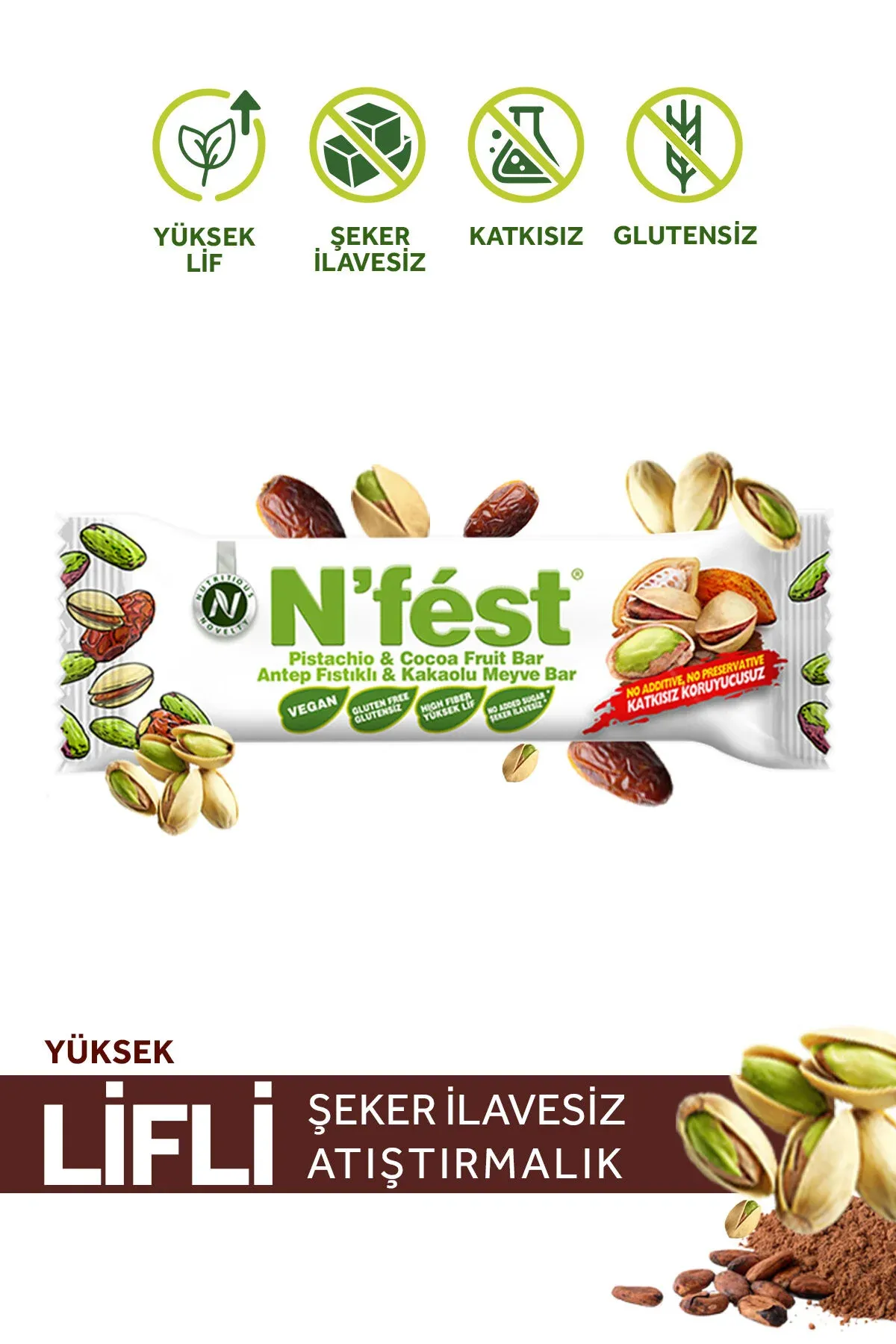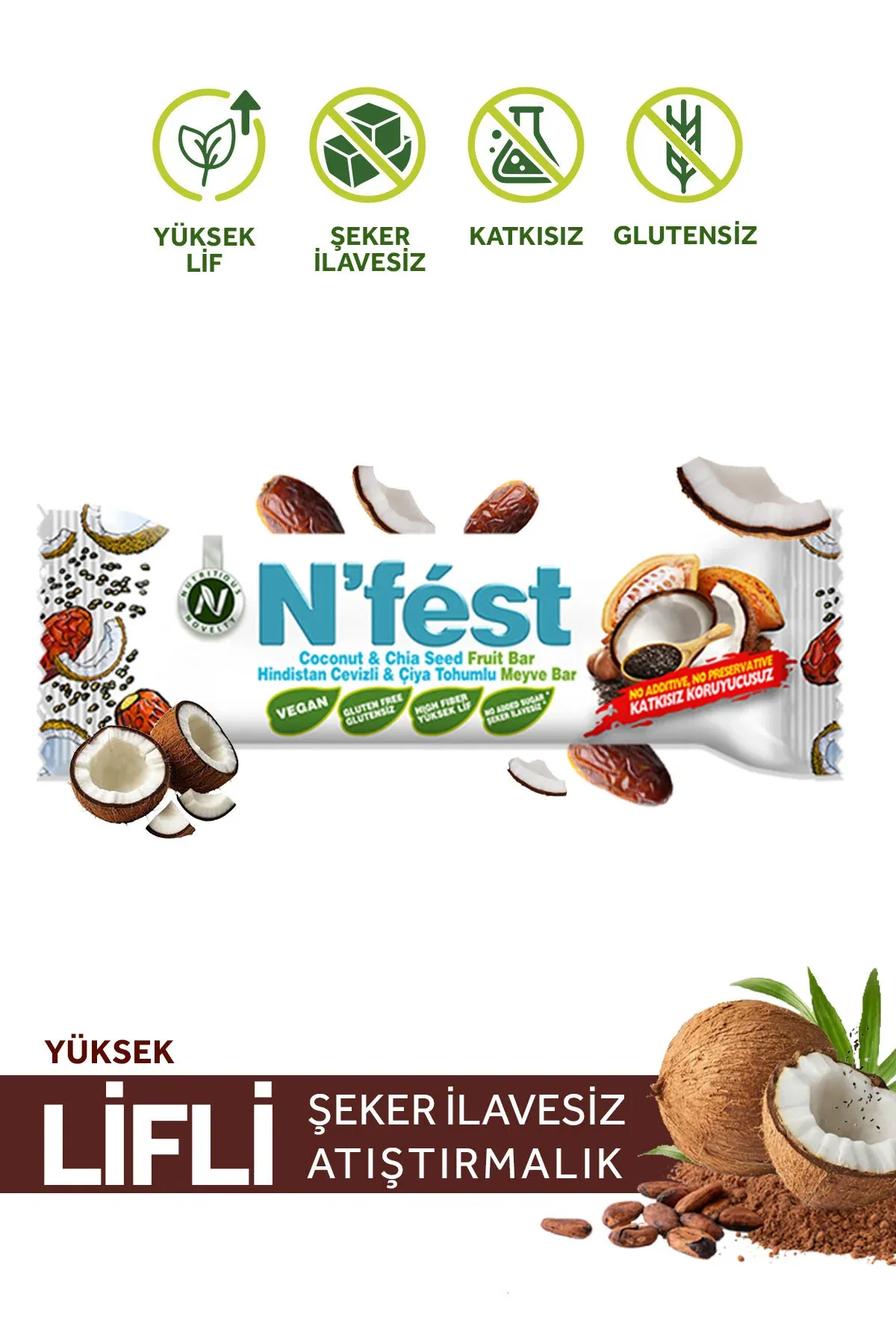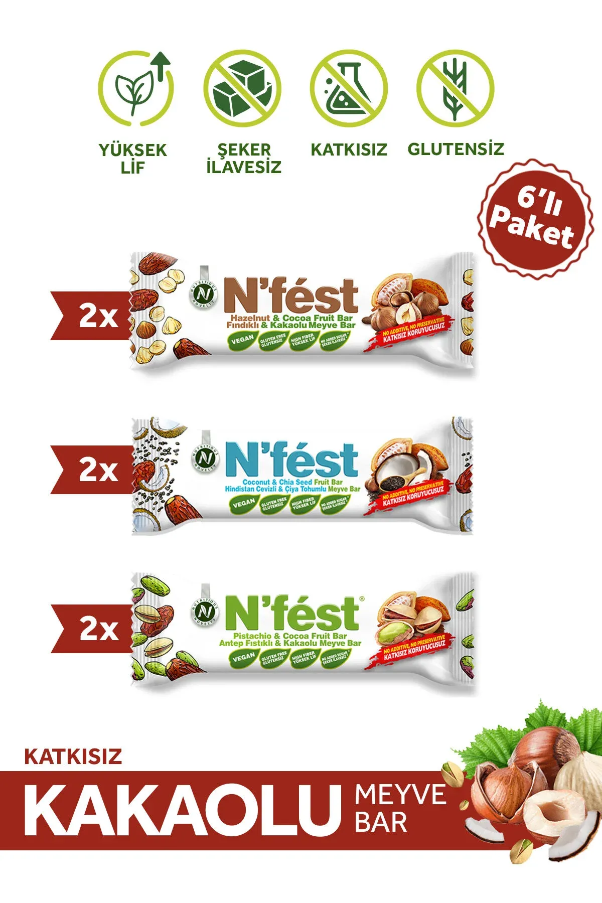 Kutu içeriğinde; ; ; 2 adet Hindistan Cevizi ve Çiya Tohumlu Meyve Bar ; ; 2 adet Antep Fıstıklı ve Kakaolu Meyve Bar ; ; 2 adet Fındıklı ve Kakaolu Meyve Bar ; ; bulunmaktadır; Antep fıstığı içerir.; Süt ürünleri, fındık, yer fıstığı, badem, ceviz ve kaju fıstığı içerebilir.