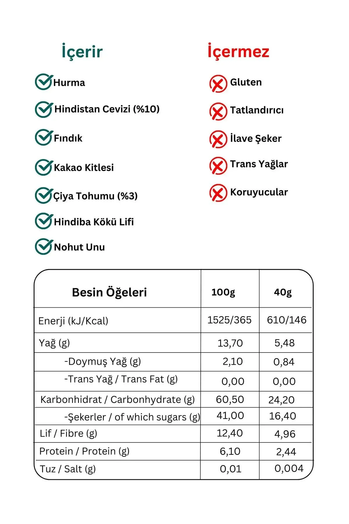 İçindekiler: Hurma, Hindistan Cevizi (%10), Fındık, Kakao Kitlesi, Çiya Tohumu (%3), Hindiba Kökü Lifi, Nohut Unu.; ; Alerjen Uyarısı: Fındık içerir.; Süt ürünleri, yer fıstığı, Antep fıstığı, badem, ceviz ve kaju fıstığı içerebilir.; ; Vegan, Glutensiz, Yüksek Lif, Hurma ile Tatlandırılmıştır.; ; Ürünlerimizin hiçbirinde domuz yağı ve katkıları yoktur.