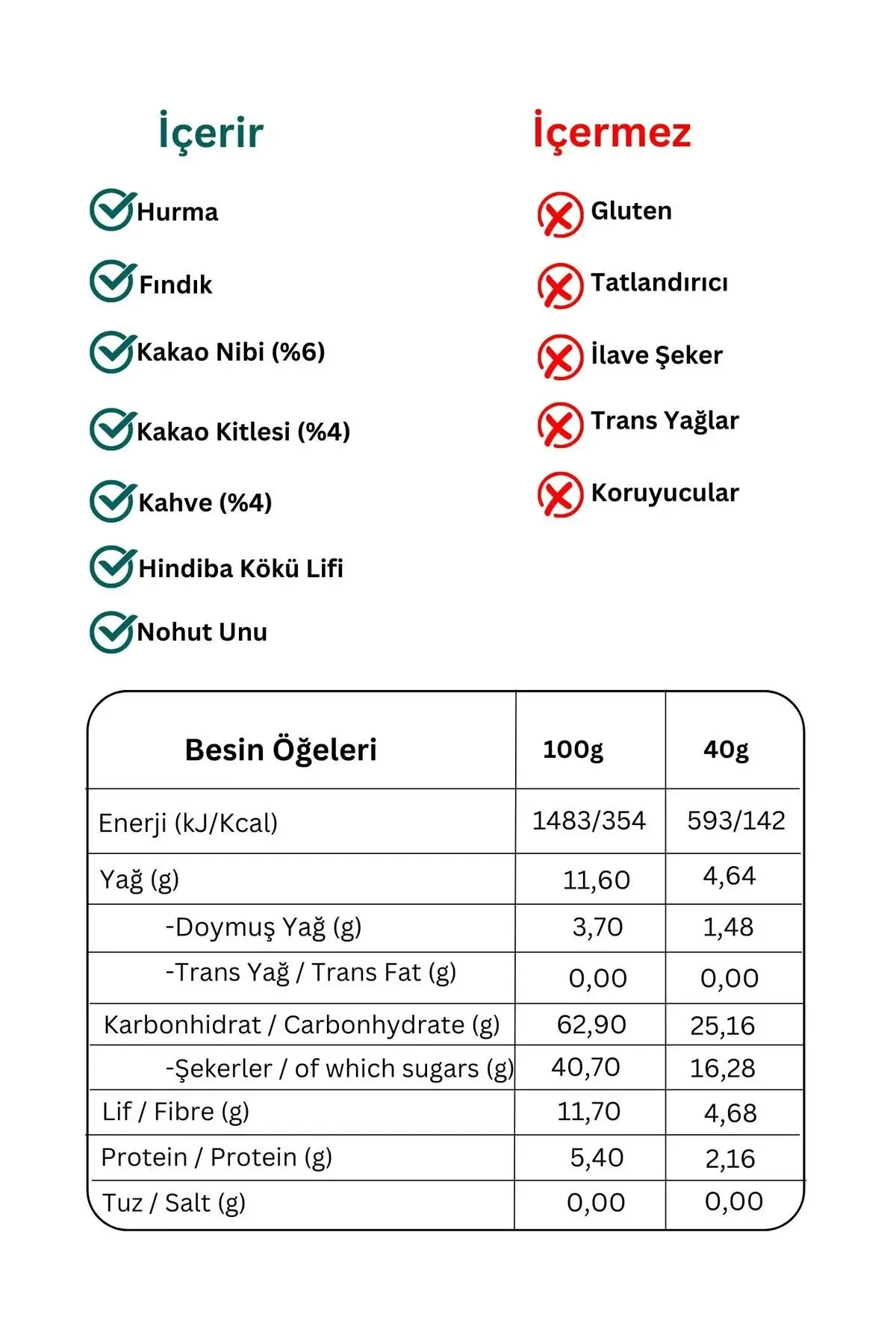 İçindekiler: Hurma, Fındık, Kakao Nibi (%6), Kakao Kitlesi (%4), Kahve (%4), Hindiba Kökü Lifi, Nohut Unu.; ; Alerjen Uyarısı: Fındık içerir.; Süt ürünleri, yer fıstığı, Antep fıstığı, badem, ceviz ve kaju fıstığı içerebilir.; ; Vegan, Glutensiz, Yüksek Lif, Hurma ile Tatlandırılmıştır.; ; Ürünlerimizin hiçbirinde domuz yağı ve katkıları yoktur.