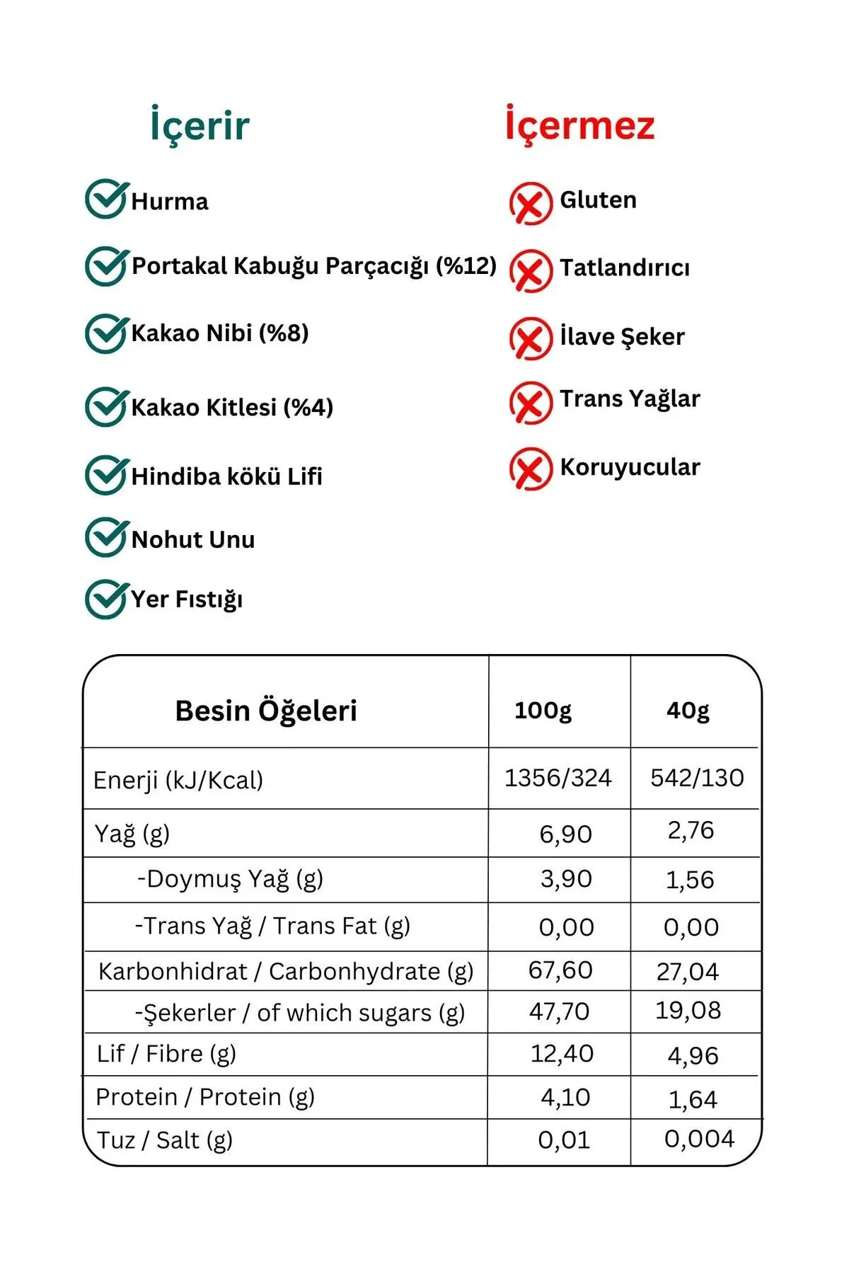 İçindekiler: Hurma, Portakal Kabuğu Parçacığı (%12), Kakao Nibi (%8), Kakao Kitlesi (%4), Hindiba Kökü Lifi, Nohut Unu, Yer Fıstığı.; ; Alerjen Uyarısı: Yer fıstığı içerir.; Süt ürünleri, fındık, Antep fıstığı, badem, ceviz ve kaju fıstığı içerebilir.; ; Vegan, Glutensiz, Yüksek Lif, Hurma ile Tatlandırılmıştır.; ; Ürünlerimizin hiçbirinde domuz yağı ve katkıları yoktur.