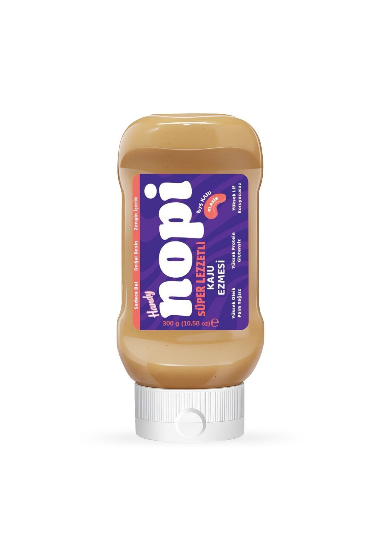 NOPI Handy Sıkılabilir Kaju Ezmesi 330g, %75 oranında seçilmiş jumbo kajuları süzme çiçek balı, yer fıstığı yağı, yağsız süt tozu ve himalaya tuzuyla buluşturuyor.; Katkısız, koruyucusuz, palm yağısız formülüyle saf malzemelerin gücünü olduğu gibi şişeye taşıyor.; Rafine şeker yok; sadece balın doğal dengesi var.; NOPI’de kullandığımız kajular yüksek oleik asit içerir.; Yani doğal olarak daha fazla tekli doymamış yağ barındırır.; Bu da kajunun tadını daha dengeli, dokusunu daha kremsi yapar.; Aynı zamanda ürünümüzün doğallığını ve tazeliğini uzun süre korumasına yardımcı olur.; Handy Serisi ile Pratik Kullanım Akışkan dokusu sayesinde ketçap şişesi formunda tasarlanan NOPI Handy, ister evde ister işte ister çantanda yanındadır.; Pratik sıkma başlığıyla kolayca açılır, dökülmeden kullanılabilir.; Spor çantan için, ofiste ara öğünlerde ya da çocukların beslenme çantasında taşıması kolaydır.; NOPI’de kalite tesadüf değil.; Tüm ürünler el değmeden, tam otomatik makinelerde ve ISO 9001, ISO 22000, GMP, HACCP sertifikalı tesislerde üretiliyor.; Her şişede aynı hijyen ve özen var.; Üstelik kullanılan kajular sadece Brezilya ve Hindistan’dan gelen jumbo sınıfı ürünlerden seçiliyor.; Pratik şişe formu sayesinde: Kaşık gerektirmez, direkt sıkılır.; Çantada taşınabilir, akma yapmaz.; Günlük kullanım için en pratik NOPI seçeneği.; İçindekiler: %75 Kaju, süzme çiçek balı, yer fıstığı yağı, yağsız süt tozu, ayçiçek lesitini ve himalaya tuzu.; Menşei: Brezilya / Hindistan – Sadece Jumbo Kajular Gramaj: 330 g Raf Ömrü: 18 ay Saklama Koşulları: Nopi’nizi serin ve kuru yerde, kapağı kapalı şekilde tutunuz.; Açıldıktan sonra 3 ay içinde tüketilmesi tavsiye olunur.; Alerjen Uyarısı: Bal içerdiğinden 1 yaş altı bebeklere uygun değildir.; Kaju içerir.; Eser miktarda yer fıstığı, fındık, ceviz, Antep fıstığı ve laktoz bulunabili