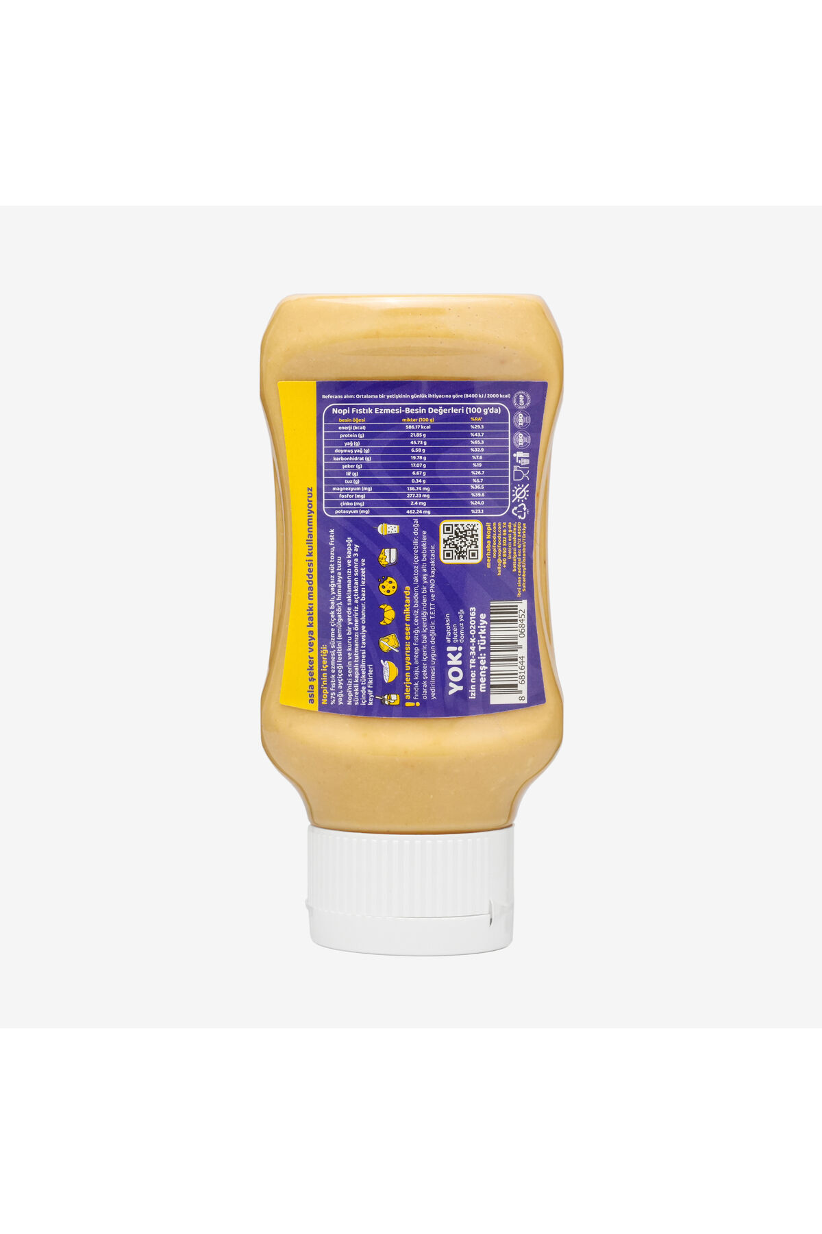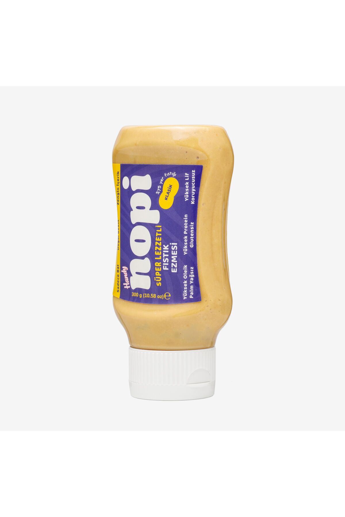 NOPI Handy Sıkılabilir Klasik Yer Fıstığı Ezmesi 330g, %75 oranında Osmaniye’nin birinci sınıf yer fıstıklarını süzme çiçek balı, yağsız süt tozu, doğal yer fıstığı yağı ve himalaya tuzuyla buluşturuyor.; Katkısız, koruyucusuz, palm yağısız formülüyle saf malzemelerin gücünü olduğu gibi kavanoza taşıyor.; Rafine şeker yok; sadece balın doğal dengesi var.; NOPI’de kullandığımız fıstıklar yüksek oleik asit içerir.; Yani doğal olarak daha fazla tekli doymamış yağ barındırır.; Bu da fıstığın tadını daha dengeli, dokusunu daha akışkan ve kremamsı yapar.; Aynı zamanda ürünümüzün doğallığını ve tazeliğini uzun süre korumasına yardımcı olur.; Handy Serisi ile Pratik Kullanım Akışkan dokusu sayesinde ketçap şişesi formunda tasarlanan NOPI Handy, ister evde ister işte ister çantanda yanındadır.; Pratik sıkma başlığıyla kolayca açılır, dökülmeden kullanılabilir.; Spor çantan için, ofiste ara öğünlerde ya da çocukların beslenme çantasında taşıması kolaydır.; NOPI’de kalite tesadüf değil.; Tüm ürünler el değmeden, tam otomatik makinelerde ve ISO 9001, ISO 22000, GMP, HACCP sertifikalı tesislerde üretiliyor.; Her şişede aynı hijyen ve özen var.; Üstelik Osmaniye’den gelen fıstıklar, yerel üreticilerin emeğini sofrana getiriyor.; Pratik şişe formu sayesinde: Kaşık gerektirmez, direkt sıkılır.; Çantada taşınabilir, akma yapmaz.; Günlük kullanım için en pratik NOPI seçeneği.; İçindekiler: %75 Yer fıstığı, süzme çiçek balı, yağsız süt tozu,yer fıstığı yağı, ayçiçek lesitini ve himalaya tuzu.; Menşei: Türkiye / Sadece Osmaniye Fıstıkları Gramaj: 330 g Raf Ömrü: 18 ay Saklama Koşulları: Nopi’nizi serin ve kuru yerde, kapağı kapalı şekilde tutunuz.; Açıldıktan sonra 3 ay içinde tüketilmesi tavsiye olunur.; Alerjen Uyarısı: Bal içerdiğinden 1 yaş altı bebeklere uygun değildir.; Eser miktarda fındık, kaju, ceviz, Antep fıstığı ve laktoz bulunabilir