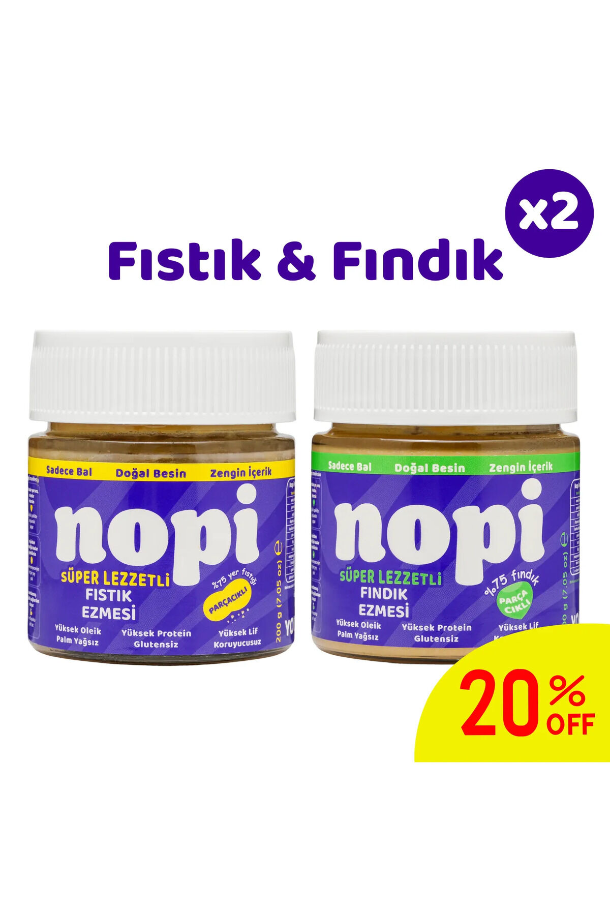 NOPI İkili Set, kıtır sevenlere özel iki parçacıklı lezzeti tek pakette sunuyor: parçacıklı yer fıstığı ezmesi ve parçacıklı fındık ezmesi.; Parçacıklı Yer Fıstığı Ezmesi 200 g: %75 Osmaniye yer fıstığıyla üretilir.; Kıtırlı yapısı sayesinde yoğun fıstık aroması ve doygun bir lezzet sunar.; Kahvaltılarda, smoothie kaselerinde veya tatlı tariflerinde farklı bir dokunuş katar.; Parçacıklı Fındık Ezmesi 200 g: %75 Giresun fındığından hazırlanır.; Yoğun aroması ve parçacıklı yapısıyla ekmek üstü sürmelik, meyve eşlikçisi ya da tatlılarda doğal bir lezzet kaynağıdır.; Her iki ürün de katkısız, koruyucusuz, palm yağısızdır.; Rafine şeker kullanılmaz; yalnızca balın doğal tatlılığı vardır.; Yüksek oleik içeriği sayesinde dengeli tat ve uzun süre tazelik sağlar.; Setin avantajı: Fıstığın enerjisi ve fındığın yoğun aroması tek pakette birleşiyor.; Kıtır sevenler için ideal bir ikili.; İçindekiler (her iki ürün için): %75 kuruyemiş (Osmaniye yer fıstığı veya Giresun fındığı), süzme çiçek balı, ilgili kuruyemiş yağı, yağsız süt tozu, ayçiçek lesitini, himalaya tuzu.; Menşei: Türkiye / Osmaniye Yer Fıstıkları & Giresun Fındıkları Gramaj: 2 x 200 g Raf Ömrü: 18 ay Saklama Koşulları: Nopi’nizi serin ve kuru yerde, kapağı kapalı şekilde tutunuz.; Açıldıktan sonra 3 ay içinde tüketilmesi tavsiye olunur.; Alerjen Uyarısı: Bal içerdiğinden 1 yaş altı bebeklere uygun değildir.; Yer fıstığı ve fındık içerir.; Eser miktarda kaju, ceviz, Antep fıstığı ve laktoz bulunabilir.;