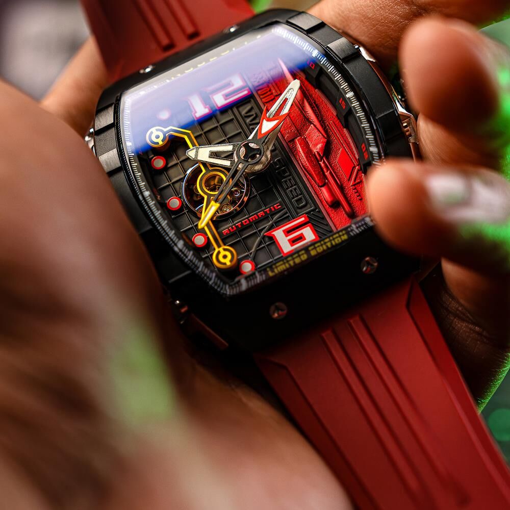 Kasa Çapı: 48 mm - Kasa Şekli: Fıçı - Kasa Materyali: Çelik - Kasa Rengi: Siyah - Kordon Materyali: Silikon - Kordon Rengi: Kırmızı- Kadran Rengi: Siyah - Kadran Işığı: Yok - Taş: Yok - Çalışma Şekli: Analog - Teknolojisi: Otomatik - Takvim: Yok - Kronometre: Yok - Alarm: Yok - Cam Özelliği: Mineral - Özellik: Kasa Kalınlığı: 17 mm - Lug to Lug: 51 mm - Saat Ağırlığı: 125 Gr - Kordon Genişliği: 26 mm - Yaklaşık Güç Rezervi 39-41 Saat - Su Geçirmezlik: 5 ATM - Garanti Süresi: 2 YIL - Cinsiyet: Erkek