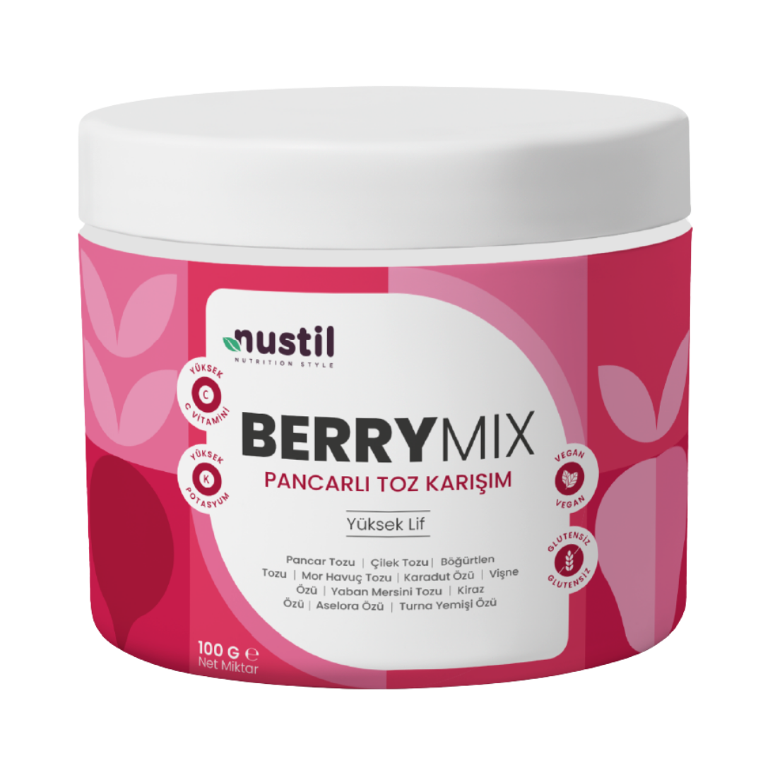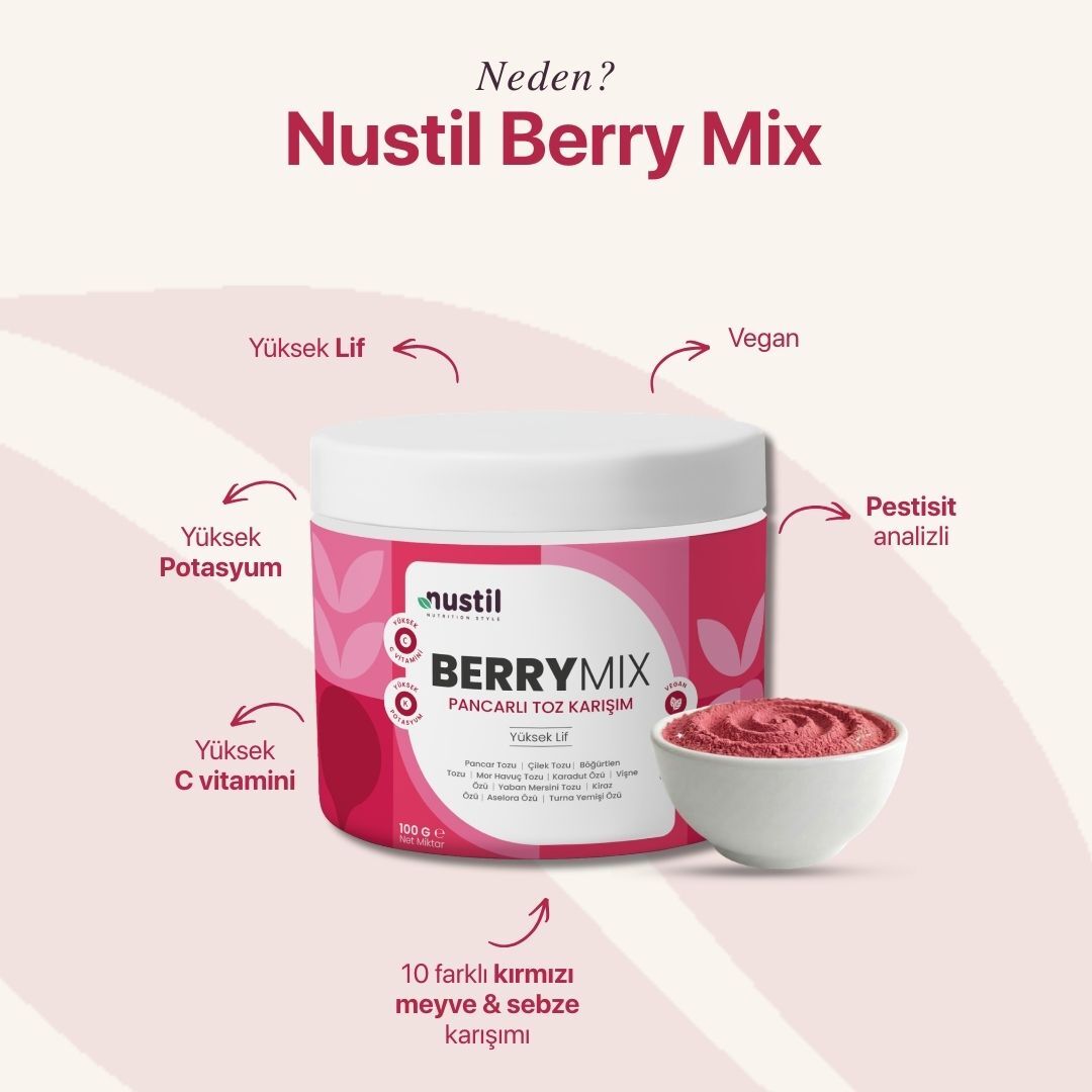 Sizin için 10 farklı kırmızı meyve ve sebzeleri bir araya getirerek Nustil Berry Mix (Pancarlı Toz Karşımı)’i yaptık. Nustil Berry Mix tamamen bitkisel olup içeriğindeki pancar, turna yemişi ve aselora sayesinde yüksek C vitamini ne sahiptir. Pancar tozu yüksek potasyum değerinede sahip olduğu için Nustil Berry Mix yüksek potasyum içerir. İçerğindeki toz kırmızı meyve özleri sayesinde hoş bir tada sahiptir. Günlük beslenme rutininize ekleyerek vücdunuzun yüksek lif, yüksek vitamin ve mineral almasını sağlayabilirsiniz.