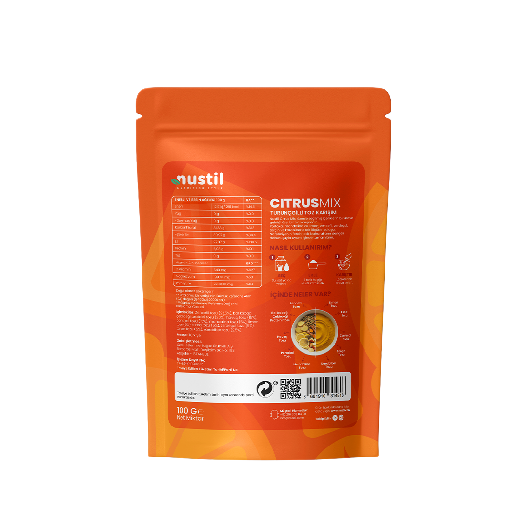 Besin Değerleri 100 g için Enerji 291 kcal Yağ 0 g Doymuş Yağ 0 g Karbonhidrat 81,38 g Şekerler 30,97 g Protein 5,03 g Lif 27,37 g Tuz 0 g C Vitamini 540 mg Magnezyum 199,44 mg Potasyum 2280,36 mg Nustil Citrus Mix Nedir?Nustil Citrus Mix, 9 farklı sebze ve meyve tozlarının özenle karıştırılmasıyla elde edilen tamamen bitkisel bir toz karışımıdır. İçeriğinde bal kabağı proteini tozu, havuç tozu, portakal tozu, karahindiba özü, limon tozu, mandalina özü, elma tozu, zencefil ve zerdeçal bulunmaktadır. Bu zengin ve besleyici karışım, yaşam tarzınızı desteklemek amacıyla geliştirilmiştir.