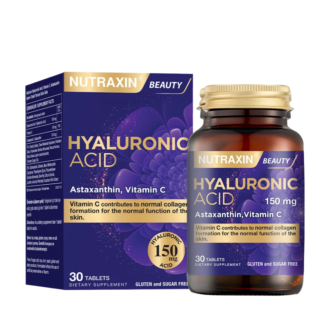 Nutraxin Hyaluronic Acid tablet, Hyalüronik asit, C vitamini ve astaksantin içeren bir formülasyondur.