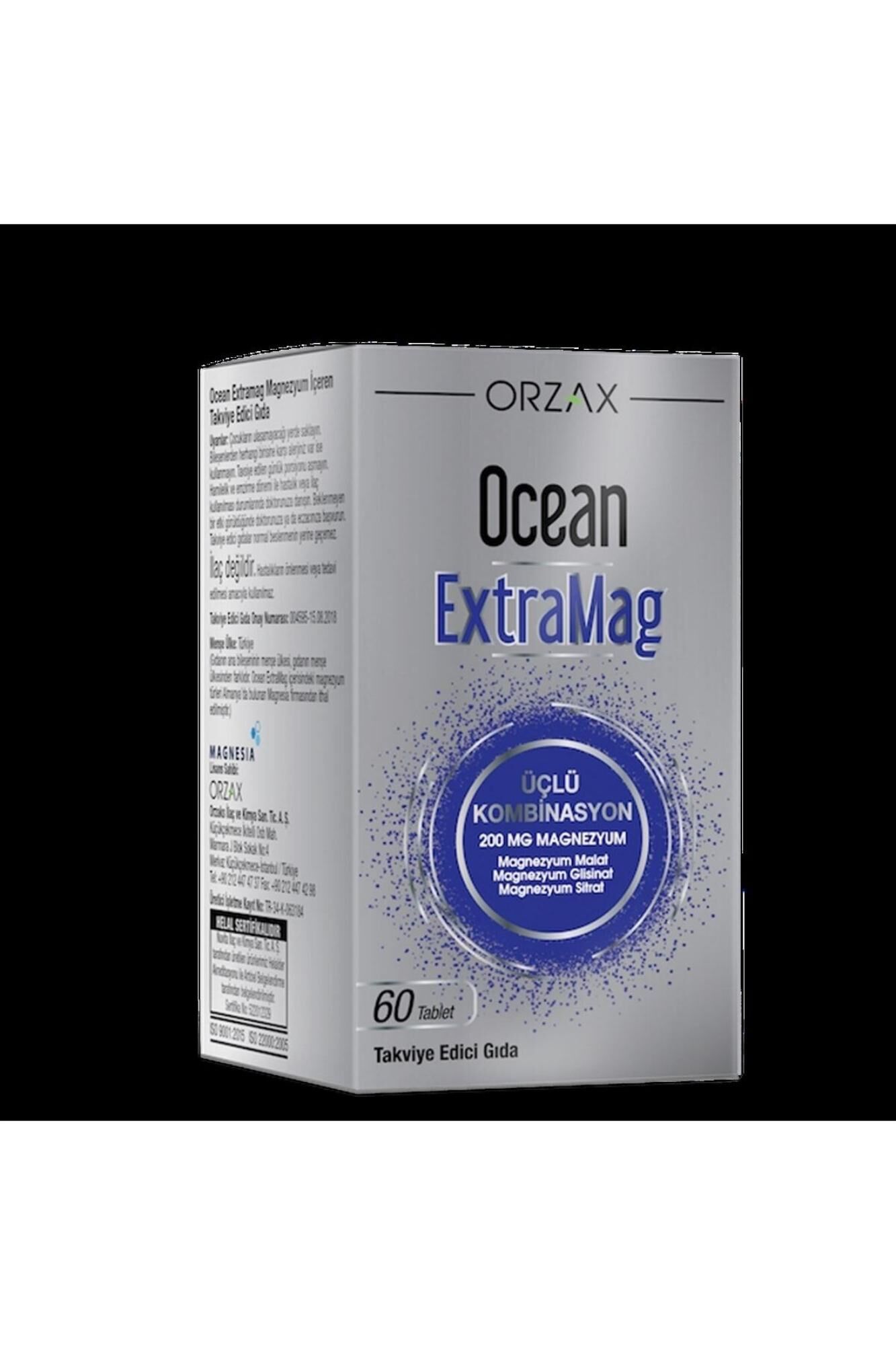 Ocean extramag 60 tablet Ocean extramag’ın her tabletinde magnezyum malat, magnezyum bisglisinat ve magnezyum sitrattan gelen 200 mg elementel magnezyum bulunur. Renklendirici içermez.