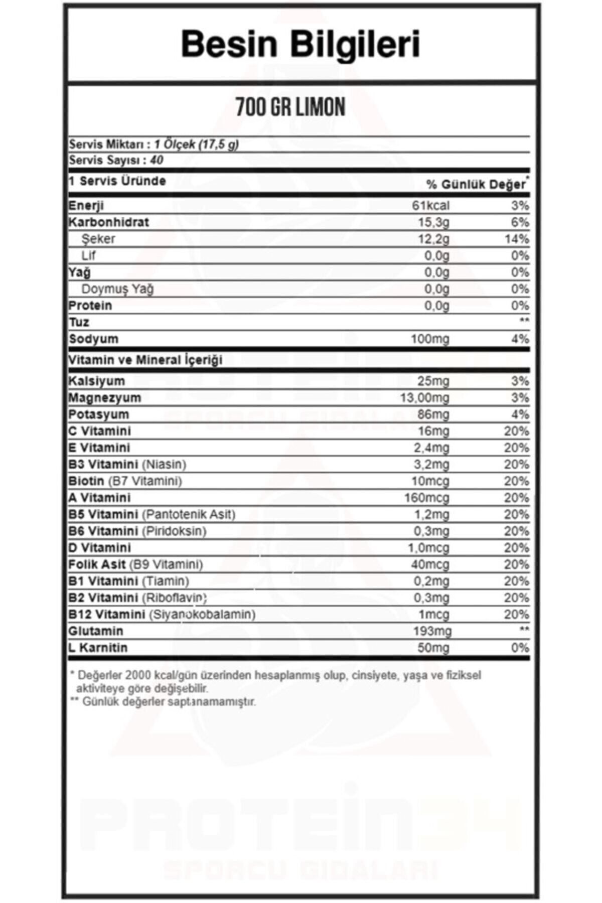 Olimp Iso Plus® L-carnıtıne 700 gr - Limon Aroma Olimp Iso Plus® L-carnıtıne 700 gr - Limon Aroma - Olimp Iso Plus Isotonic Drink 700 Gr Özellikleri Servis Sayısı : 40 Servis Miktarı : 700 gram Servis Başı Fiyat : 2.25 TL Olimp Iso Plus Isotonic Drink 700 Gr Nedir? Olimp Iso Plus toz formda olup limon aromalıdır. ; Ürün izotonik bir üründür. Antrenman esnasında kaybetmiş olduğunuz su ve minerallerin alınmasında yardımcı olabilir. Ayrıca bu ürün sporcunun performansını artırabilir ve idman verimliliğine yardımcı olabilir. Olimp Iso Plus Isotonic içeriğinde az miktarda L-Carnitine de içermektedir. ; Olimp Iso Plus Isotonic Drink 700 Gr'nin Özellikleri - Karnitin ve glutamin içermesi - Zengin vitamin-mineral içeriği Olimp Iso Plus Isotonic Drink 700 Gr İçeriği % Günlük Değer** Servis Sayısı : 40 Servis Miktarı : 1 Ölçek (17,5 g) Enerji 61,2kcal 0% Protein 0mg 0% Karbonhidrat 15,3gr 0% Çözünebilir Lif 0mg 0% Şeker 12,2gr 0% Yağ 0gr ** Doymuş yağ 0gr ** Sodyum 0,1gr 0% Glutamin 192,5mg 0% Karnitin 50mg 0% Potasyum 85,7mg 4,3% Kalsiyum 25mg 3,1% Magnezyum 12,6mg 3,3% C Vitamini 16mg 20% E Vitamini 2,4mg 20% B3 Vitamini(Niasin) 3,2mg 20% B7 Vitamini(Biotin) 10mcg 20% A7 Vitamini 160mcg 20% B5 Vitamini (Pantotenik Asit) 1,2mg 20% B6 Vitamini (Piridoksin) 0,3mg 20% D Vitamini 1mcg 20% Folik Asit 40mcg 20% B1 Vitamini(Tiyamin) 0,2mg 20% B2 Vitamini (Riboflavin) 0,3mg 20% B12 Vitamini (Siyanokobalamin) 0,5mcg 20% ** ; Günlük değerler saptanamamıştır.; ;