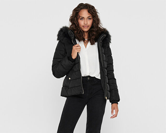 Only Onlcamilla Quilted Furhood Jacket Cc Otw Kadın Günlük Mont 15204607-BLACK Siyah
