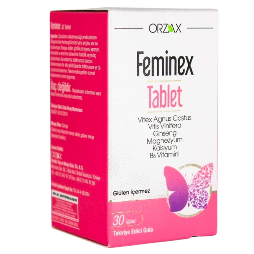 Orzax Feminex kadınların ihtiyaçlarına yönelik olarak bitkisel ekstreler ile kalsiyum, magnezyum ve B6 vitaminini bir araya getiren kompleks bir gıda takviyesidir. İçeriğinde hayıt (Vitex agnus castus), Panax ginseng ve üzüm çekirdeği ekstresi gibi bileşenler yer alır. Bunlar vitamin mineral matrisiyle birlikte formülün kadınlara özel konumlandırılmasını destekler.