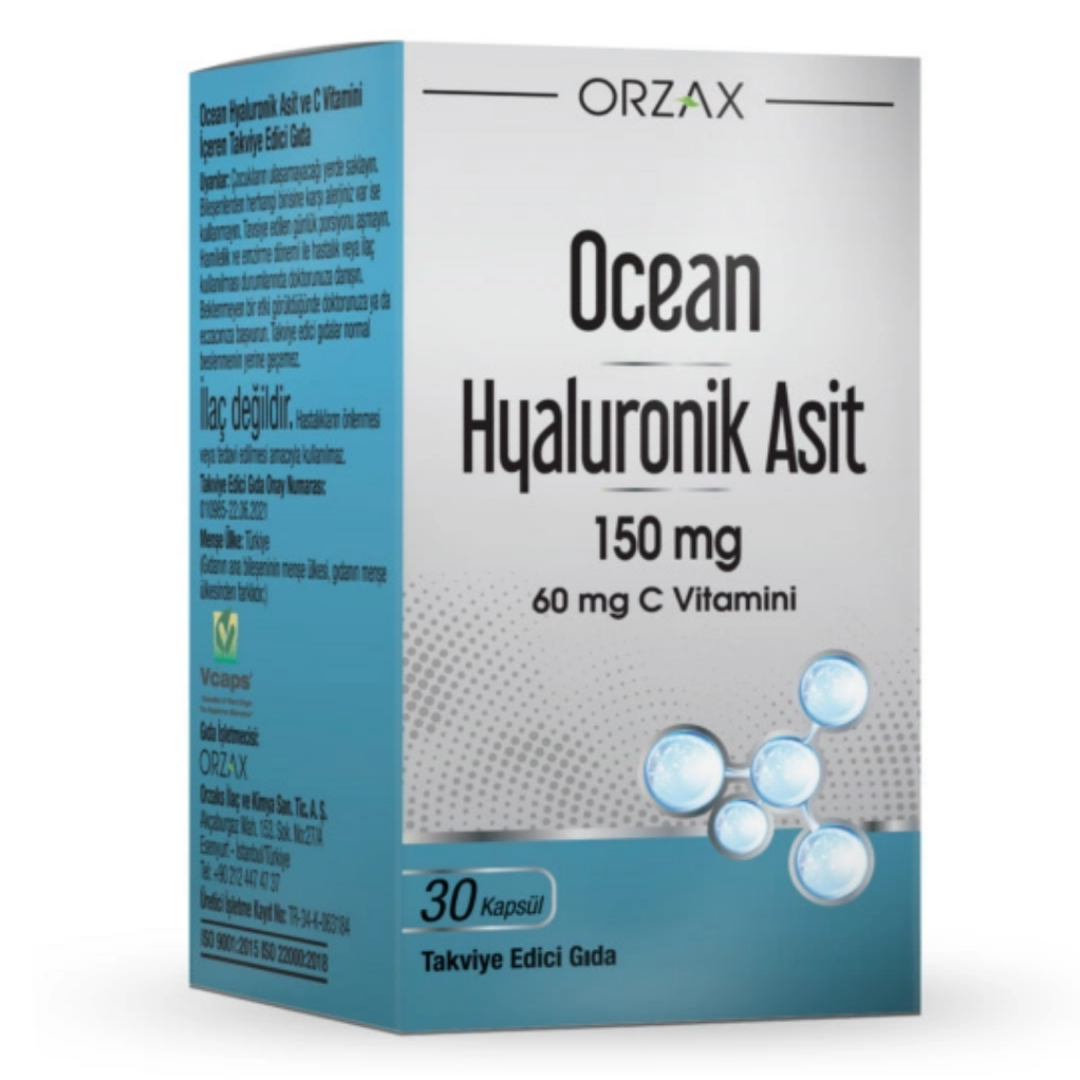 Orzax Ocean Hyaluronik Asit her kapsülde 150 mg hyaluronik asit ve 60 mg C vitamini bir arada sunan kompleks bir takviyedir. Hyaluronik asit yapısı streptokok (S. zooepidemicus) suşlarının fermantasyonu ile elde edilen düşük molekül ağırlıklı ve yüksek saflıkta bir hammaddedir.