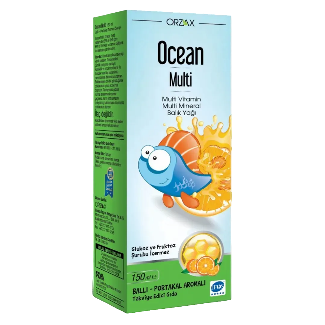 Orzax Ocean Multi Balık Yağı Ballı Portakal Aromalı Şurup çocukların günlük vitamin, mineral ve omega 3 alımını desteklemek amacıyla tasarlanan ballı portakal aromalı bir multivitamin balık yağı şurubudur. İçeriğindeki balık yağı, temiz ve soğuk denizlerde yaşayan küçük tür balıklardan elde edilir. Yağ, IFOS onaylı kalite standartlarına göre saflık ve ağır metal açısından kontrol edilir. Formülde renklendirici, tatlandırıcı ve yapay aroma verici bulunmaz.