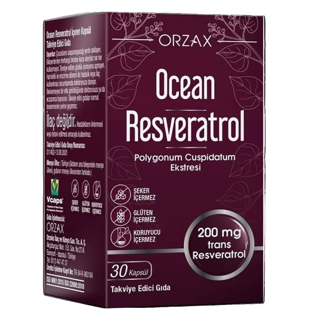 Orzax Ocean Resveratrol Takviye Edici Gıda içeriğindeki resveratrolü Japon poligonumu bitkisinin kök ekstresinden sağlayan kapsül formda bir gıda takviyesidir. Her kapsülde 205 mg bitki ekstresinden gelen 200 mg trans resveratrol bulunur ve kapsül yapısı hidroksipropil metilselüloz esaslı bitkisel kapsüldür. Bu sayede ürün vegan ve vejetaryen kullanımına uygun olarak tanımlanmaktadır.