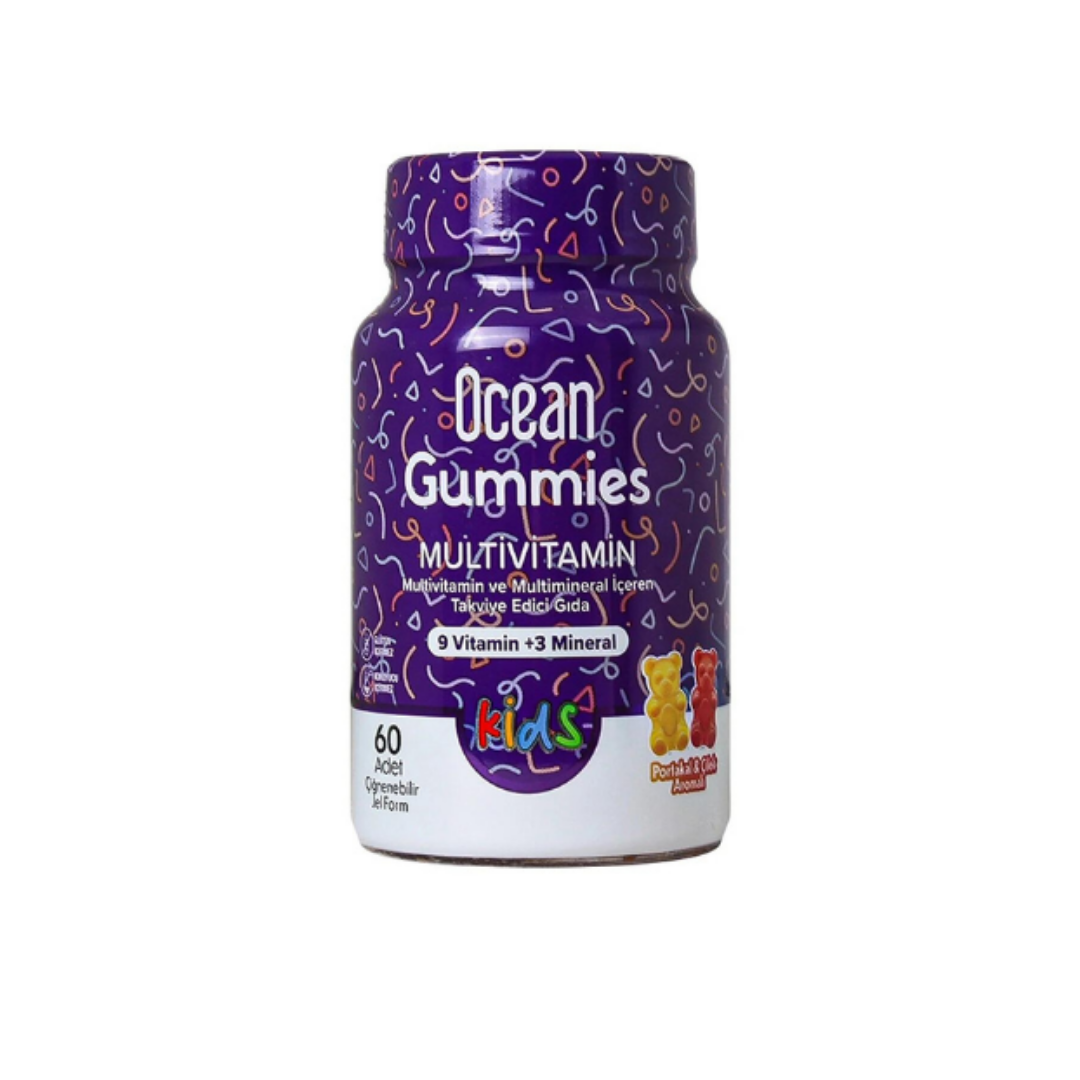 Ocean Smart Gummies Multivitamin, 60 adet çiğnenebilir jel formu ile 9 vitamin, 3 mineral ve inositol içeren bir gıda takviyedir. Limon, portakal, çilek ve elma doğal meyve aroması içerir. Tavsiye edilen günlük porsiyon miktarı 4-10 yaş grubu çocuklar için 2 jel form, 11 yaş üzeri bireyler ve yetişkinler için 4 jel formdur.