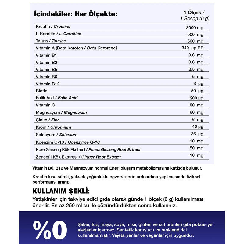 | Bileşen | Miktar (1 Ölçek / 6g) |