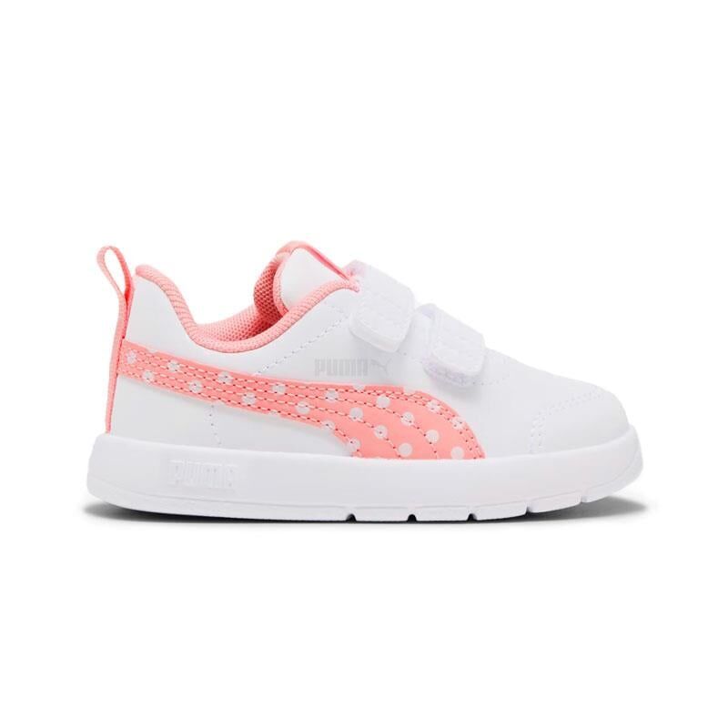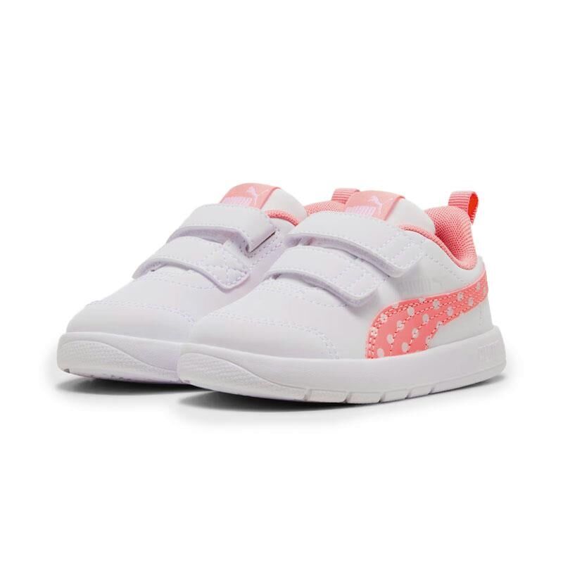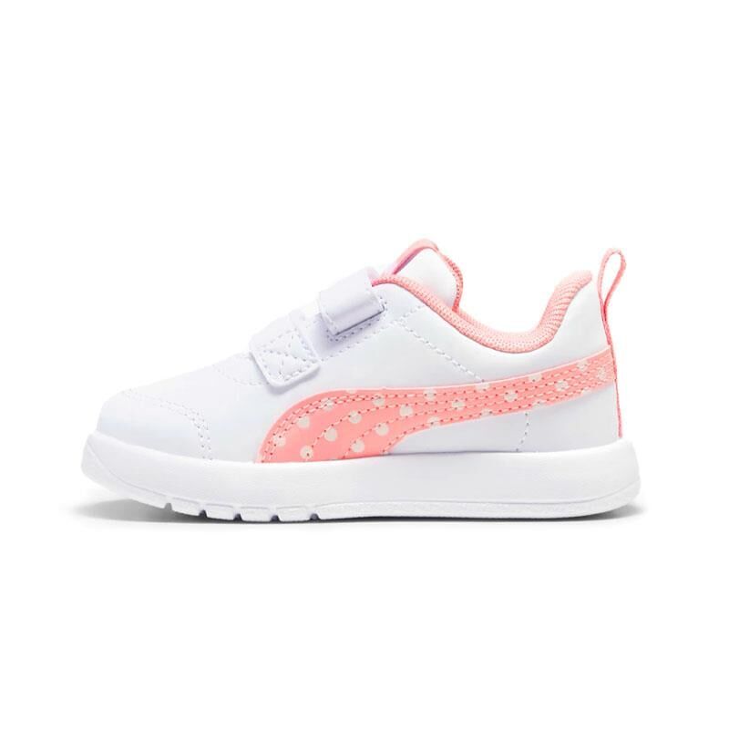 Puma Courtflex V3 Dotty V Ps, çocuklar için hem eğlenceli hem de konforlu bir günlük ayakkabıdır. Kolay giyilebilen cırt cırtlı tasarımı sayesinde minik ellerle rahatça kullanılabilir. Hafif ve esnek yapısı, gün boyu oyun ve hareket için idealdir. Beyaz zemin üzerine yerleştirilen pembe puantiyeli detaylar, sevimli ve enerjik bir görünüm kazandırır.
