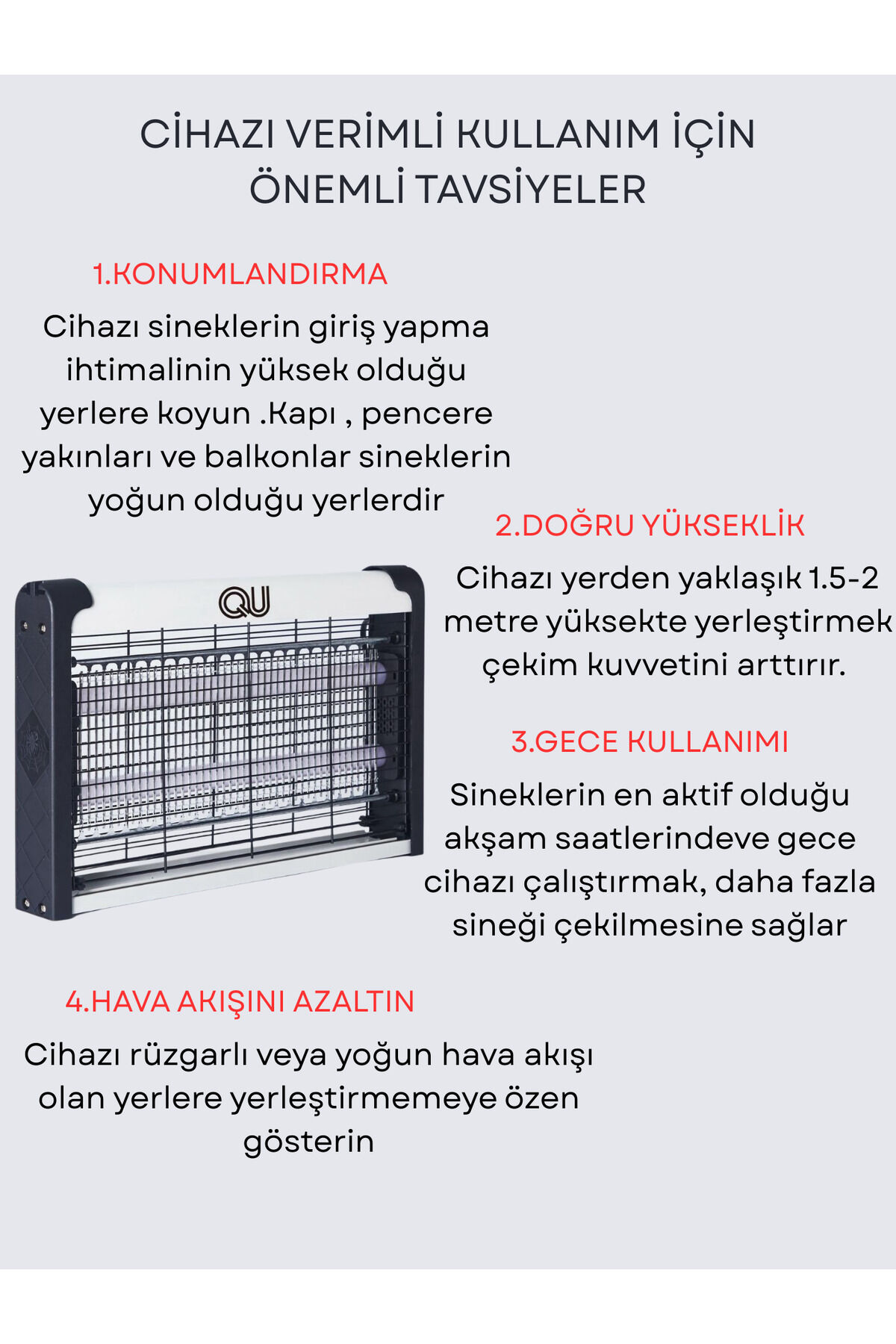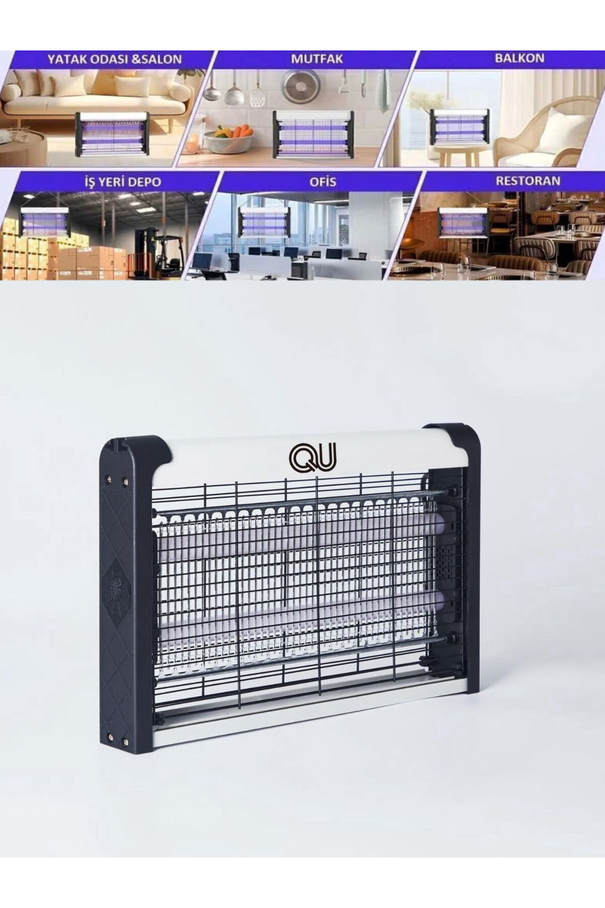 QU300SO UVIŞIKLI SİNEK ÖLDÜRÜCÜ (20W) Kapsama Alanı: 50m'2 Kimyasal madde kullanmadan, kokusuz, dumansız,hijyenik ve etkili bir çözüm yolu sunar. Güçlü : 20 watt gücünde yüksek kapasiteli LED teknolojisi ileetkili ve hızlı bir şekilde sinekleri öldürür.İki LED özelliği: Birden fazla sinek türüne karşı etkili olan iki LED ilegeniş spektrumda etkili bir öldürme performansı sunar. Kolay kullanım: Pratik tasarımı sayesinde herhangi bir ekstra aksesuar ihtiyaç duymadan kolayca kullanılabilir. Uzun ömürlü: Dayanıklı yapısı ile uzun süreli kullanım için idealdir ve sık değiştirme gerektirme.Ürün Açıklaması Elektrikli uv sinek öldürücü, ev ve iş yerlerinizde etkili bir şekilde sinekleri uzaklaştırır Makine formundaki tasarımı sayesinde, kolayca taşınabilir ve istenilen her yere rahatlıkla yerleştirilebilirUV ışınları ile sinekleri anında etkisiz hale getirerek, sağlıklı bir yaşam alanı sağlar Zincirli askısı sayesinde, cihazın güvenli bir şekilde asılmasını ve sabit kalmasını sağlar