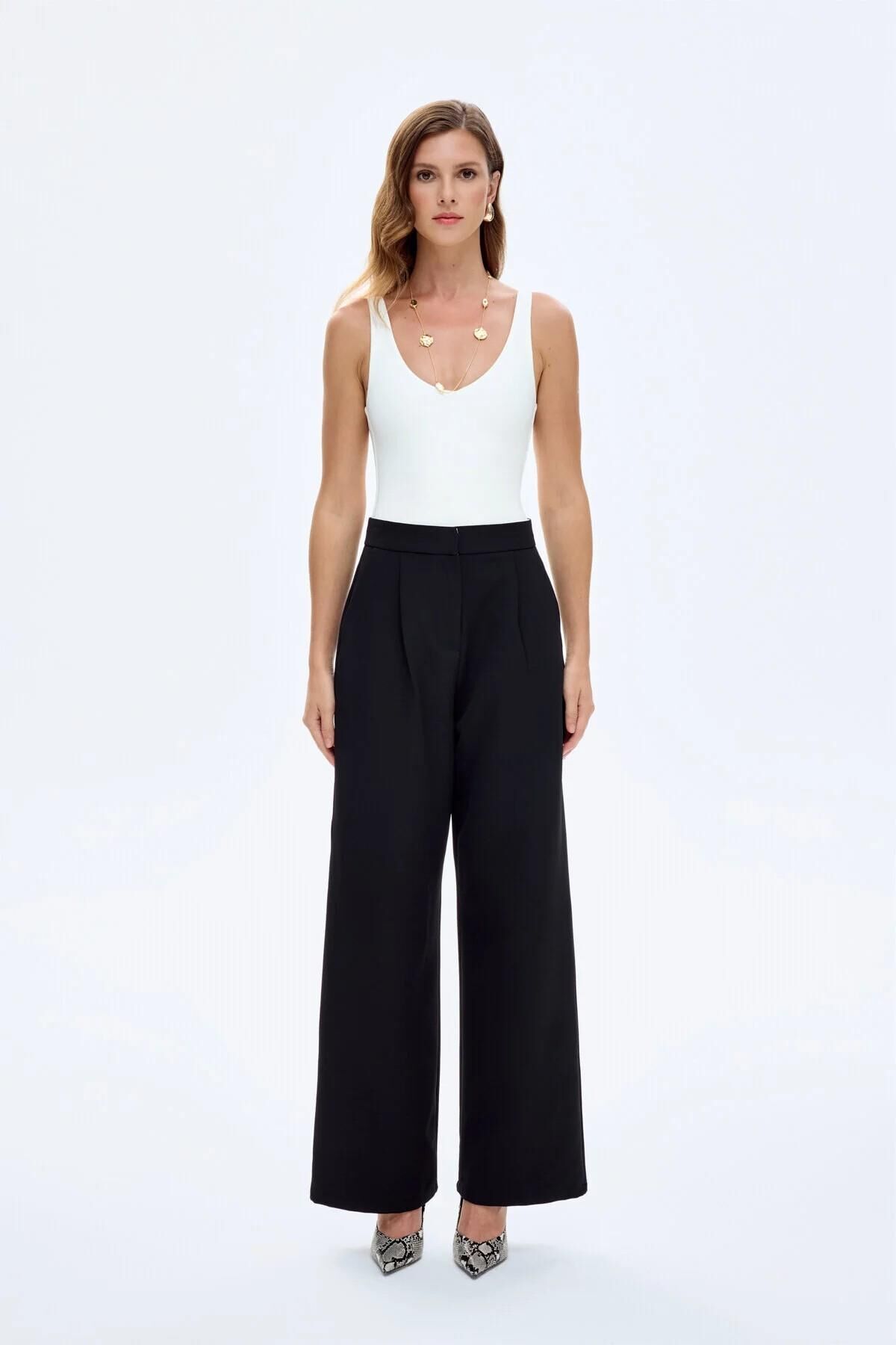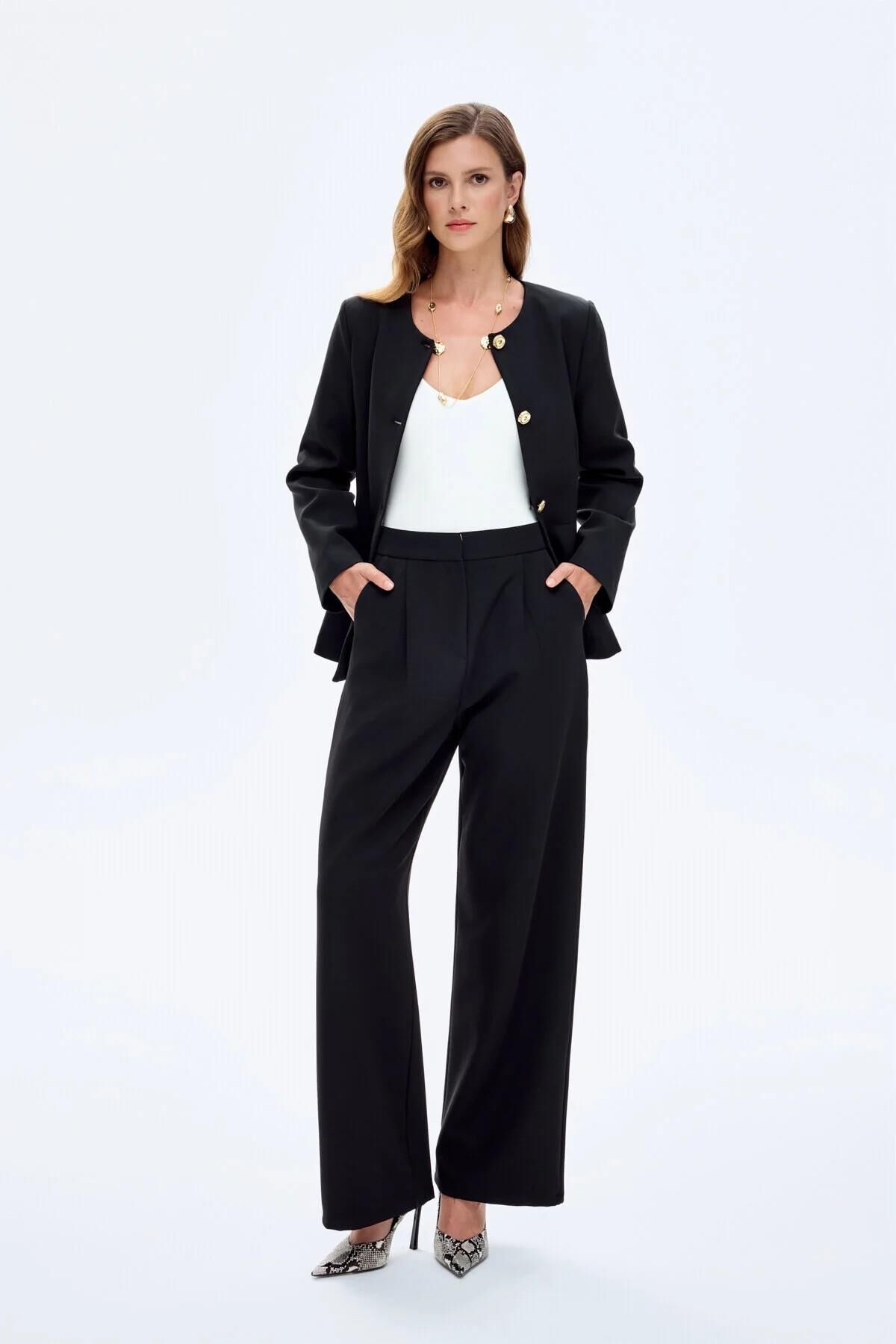 Düz kesim, yüksek bel, yan cepli, fermuarlı ve kanca kapamalı, pile detaylı, uzun boy, bol paça kumaş pantolon. Kumaş Bilgisi : Elastan %5, Polyester %95 Ürün/Manken Ölçüleri : Ürün Boy Ölçüsü: 112 cm Bel: 35 cm Basen: 54 cm / Manken Ölçüleri: Boy:1.75 Göğüs:78 Bel:60 Basen:90 Beden:S
