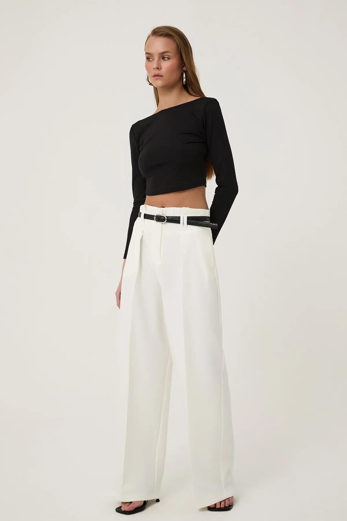 Yüksek belli, cepli,önü pileli, kemer detaylı pantolon. Kumaş Bilgisi : Elastan %5, Polyester %95 Ürün/Manken Ölçüleri : Ürün Boy Ölçüsü: 111 cm Bel: 36 cm / Manken Ölçüleri: Boy:1.75 Göğüs:78 Bel:60 Basen:90 Beden:S Yıkama Talimatları : Makinede 30° Yıkayabilirsiniz Gerektiğinde Klorsuz Çamaşır Suyu Konabilir Kurutma Makinesinde , Normal, Düşük Isıda Düşük Isıda Ütüleyiniz Kuru Temizleme , Az Çözücü