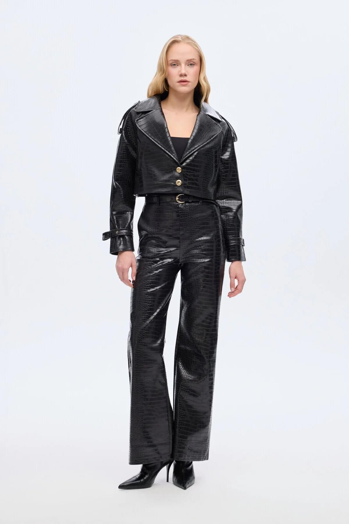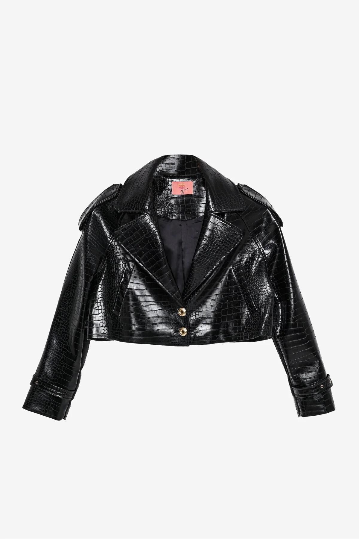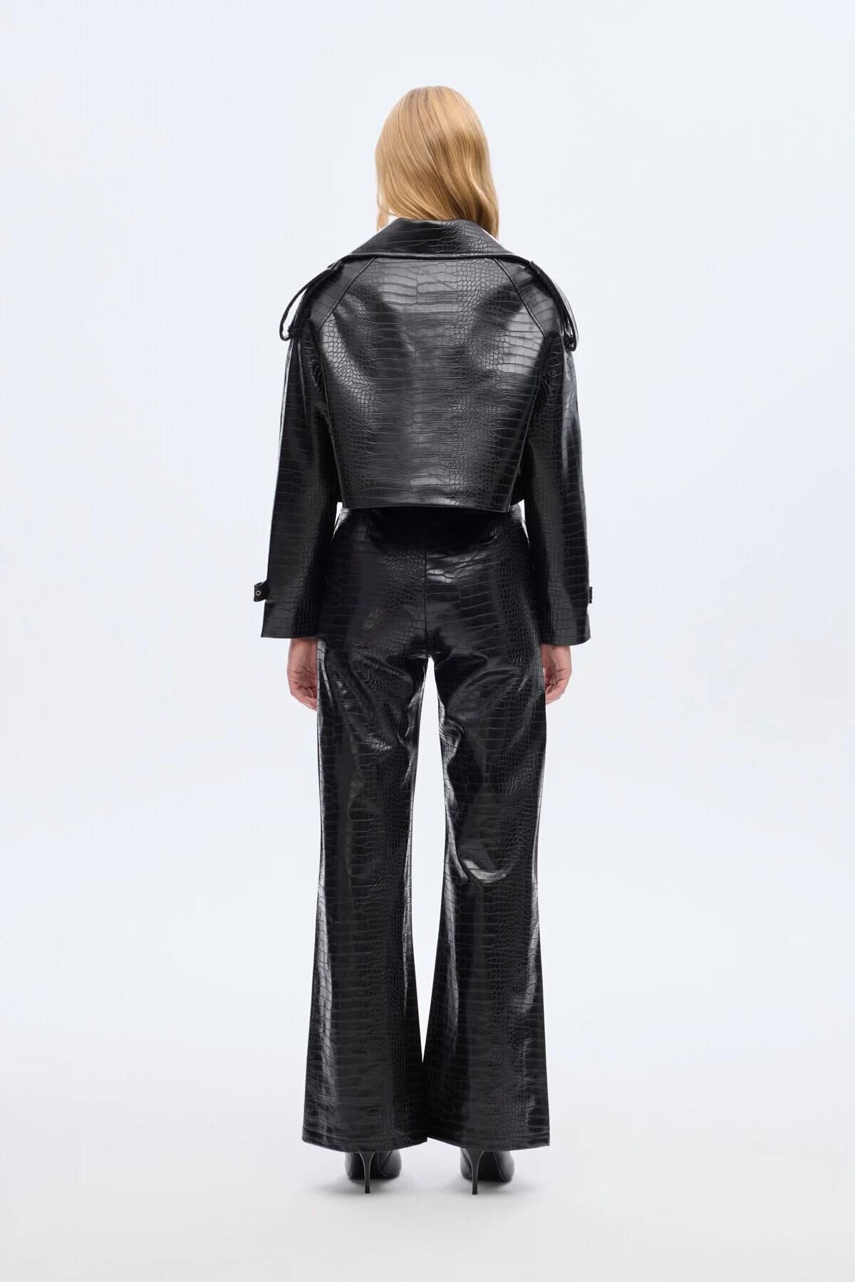 İçi astarlı, kroko desen dokulu, yan cepli, omzu apoletli, çift düğmeli, kolları ayarlanabilir kemer detaylı, uzun kollu, crop boy suni deri ceket. Kumaş Bilgisi Polyester %100 Ürün/Manken Ölçüleri Ürün Boy Ölçüsü: 45 cm Göğüs: 57 cm Yıkama Talimatları Makinede 30° Yıkayabilirsiniz Gerektiğinde Klorsuz Çamaşır Suyu Konabilir Kurutma Makinesinde , Normal, Düşük Isıda Düşük Isıda Ütüleyiniz Kuru Temizleme , Az Çözücü