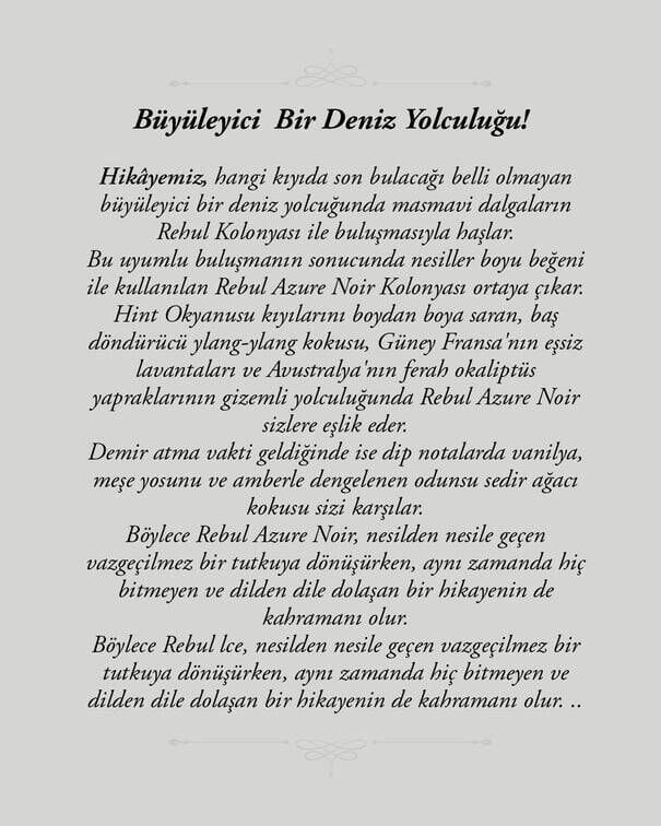 “Aldığınız her REBUL bir tohuma dönüşüyor, mis gibi nefesler alabilmeniz için.” anlayışıyla sunulan Azure Noir, doğaya değer katarken size enerji ve tazelik sunar. Günlük yaşamınıza ferah bir imza katan bu koku, her mevsimde favoriniz olmaya aday! Kendinizi Azure Noir’ın büyüleyici esintisine bırakın ve gün boyu enerjik kalın.