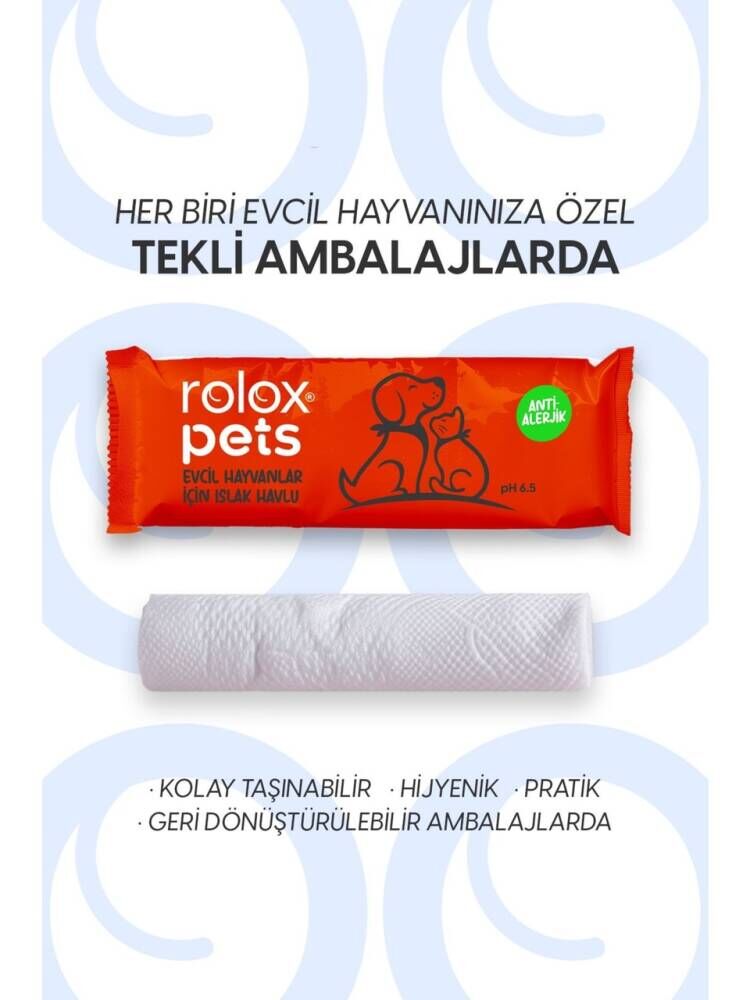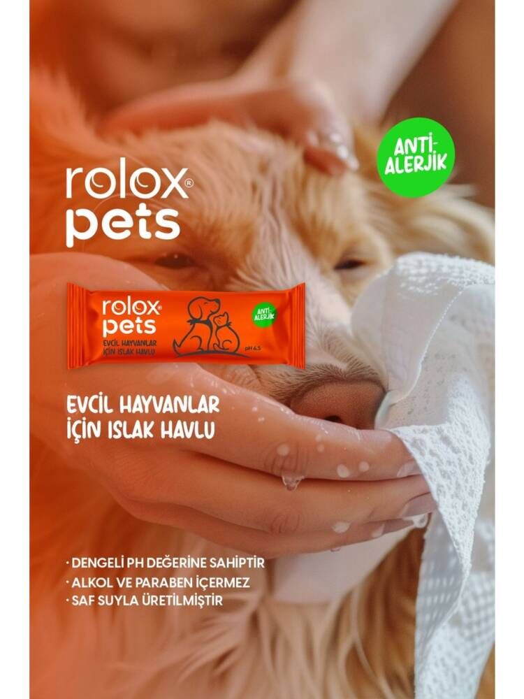 Rolox Pets, evcil dostlarınız için özel olarak üretilen devrim niteliğinde bir temizlik havlusudur. Her biri tekli ambalajlarda bulunan ıslak havlular, evcil hayvanlarınızın temizlik ihtiyaçlarını anında ve etkili bir şekilde karşılar. Formülü; paraben, alkol ve parfüm içermeyen özel bir yapıya sahiptir. Rolox Pets, 6,5 pH değerindeki su ile üretilerek hassas ciltli dostlarınızın cildindeki pH değerini dengeleyerek güvenli bir temizlik deneyimi sunar.