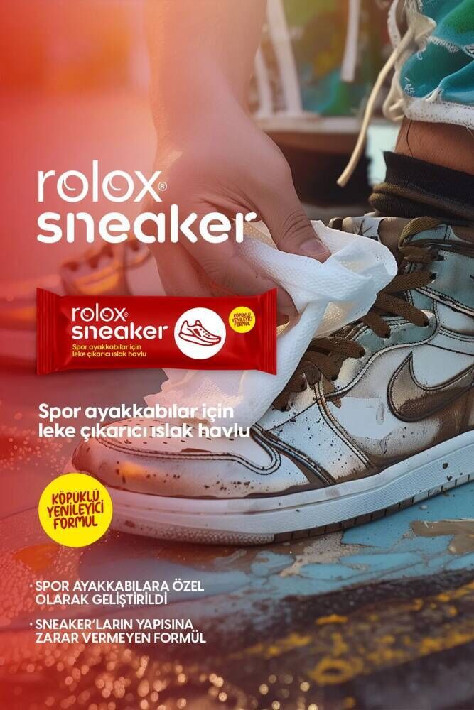 Rolox Sneaker, spor ayakkabılarınızın en iyi dostu! Her renk ve türdeki ayakkabınızı kolayca temizleyebileceğiniz bu leke çıkarıcı ıslak havlu, spor ayakkabınıza kesinlikle zarar vermez. Beyaz sabun kokulu, bol köpüklü ve yenileyen özelliğiyle öne çıkan Rolox Sneaker’ı deri, suni deri ya da kumaş farketmeksizin tüm ayakkabılarınızda kullanabilirsiniz. Pratik tekli ambalajı sayesinde her an yanınızda. taşıyabilirsiniz.