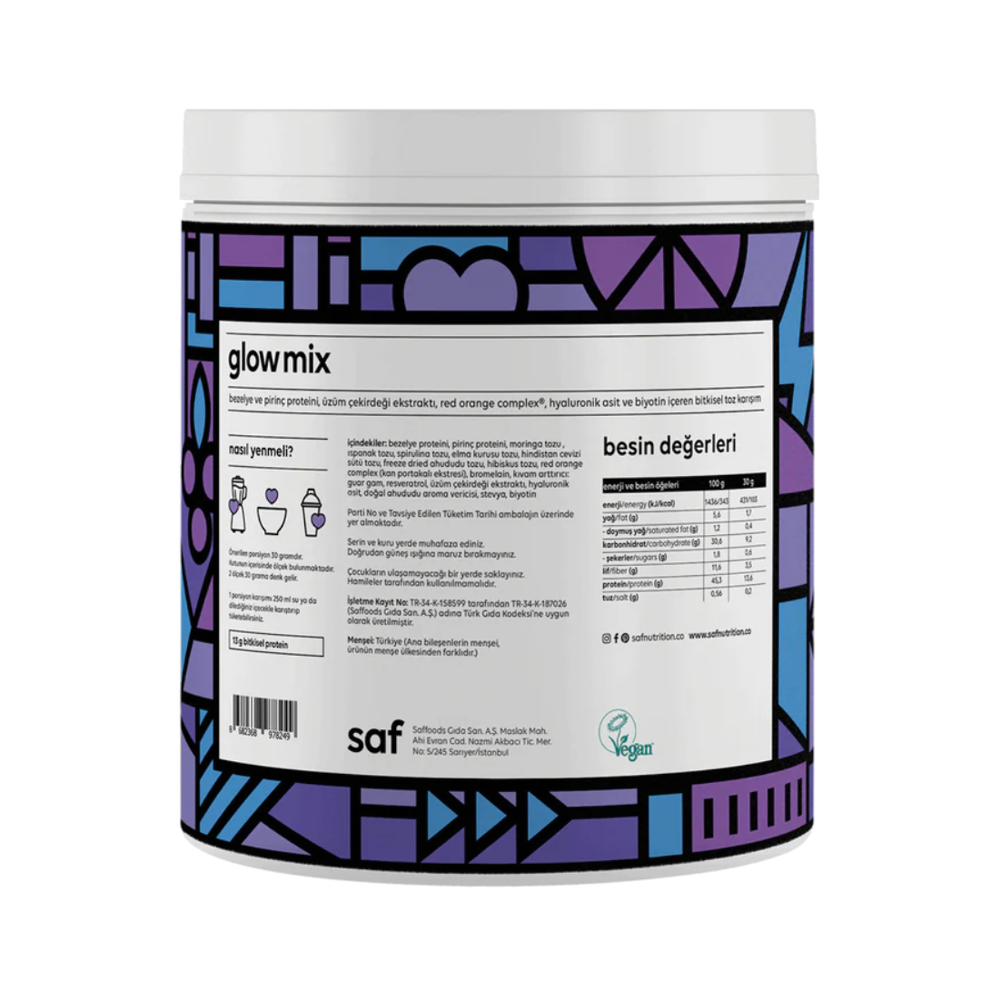 Saf Protein Superfood Mix Glow Nasıl Kullanılır?30 g (2 ölçek) ürünü 250 ml su veya bitkisel sütle karıştırarak tek seferde hazırlayabilir, damak tadınıza göre sıvı miktarını ayarlayabilirsiniz. Günde 1‑2 servis kullanılması önerilmektedir.