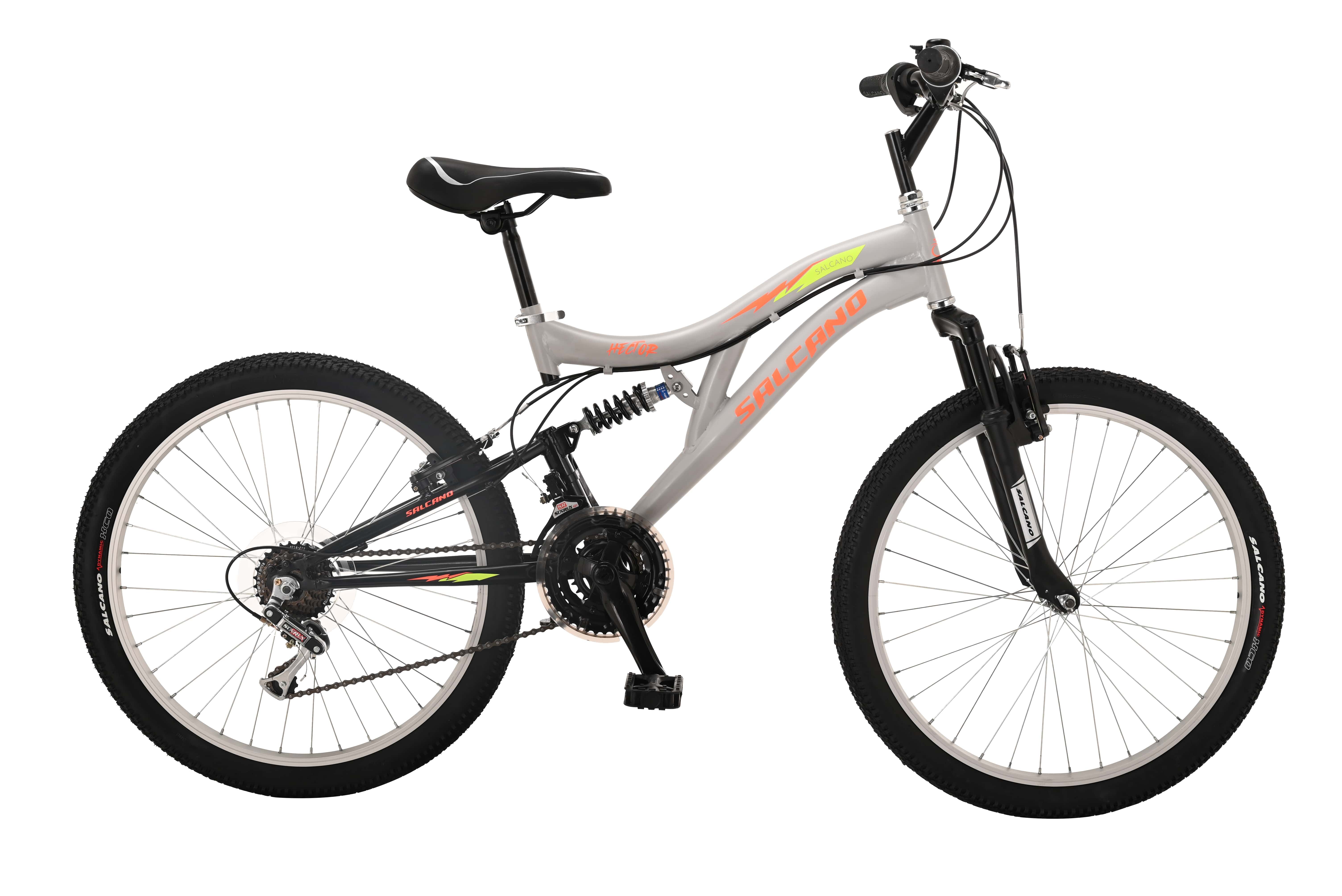 Salcano Hector 24, 2026 model yılı ile gelen, 24 inç tekerlek ölçüsünde ve hem ön hem arka (çift) amortisörlü tam donanımlı bir gençlik dağ bisikletidir (MTB). 135-155 cm boy aralığındaki çocuk ve gençler için, asfalttan toprak yollara kadar daha konforlu ve kontrollü bir sürüş deneyimi sunmak üzere tasarlanmıştır. 21 vitesli Microshift/Sunrun aktarma grubu, alüminyum V-frenler ve özel jant seti ile, görünümün ötesine geçen gerçek bir hafif arazi yeteneği vaat eder. 14 inç kadro, genç sürücülere mükemmel kontrol sağlar.