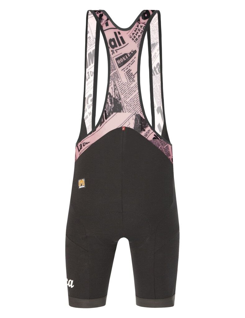 Dış yüzeyi yün, iç yüzeyi poliamidden oluşan özel kumaş yapısı, doğal liflerin nefes alabilirliğini sentetik malzemelerin dayanıklılığı ile birleştirir. Fileli askılarındaki eski Gazzetta dello Sport makalelerinin baskıları, bisiklet tarihine saygı duruşunda bulunan eşsiz bir detaydır. Jel çekirdekli Git güderisi ile uzun mesafelerde konfor sunan bu tayt, uyluktaki Eroica işlemesiyle de koleksiyon değerini vurgular.