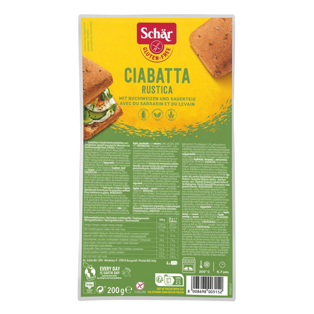 Schar Ciabatta Rustica karabuğday unu, ayçiçeği çekirdeği, keten tohumu ve ekşi hamurla zenginleştirilmiş glutensiz esmer ciabatta ekmeğidir. Ön pişirilmiş formu sayesinde fırında birkaç dakikada dışı çıtır, içi yumuşak hale gelen rustik dokulu ekmek topları sunar. İçeriğinde buğday unu, arpa, süt, süt ürünü veya laktoz bulunmaz. Tohum ve tam tahıl içeriği klasik beyaz glutensiz ekmeklere göre daha aromatik bir tat ile dolgun bir yapı kazandırır. Kahvaltıdan ana öğünlere kadar çok yönlü kullanım sağlar.