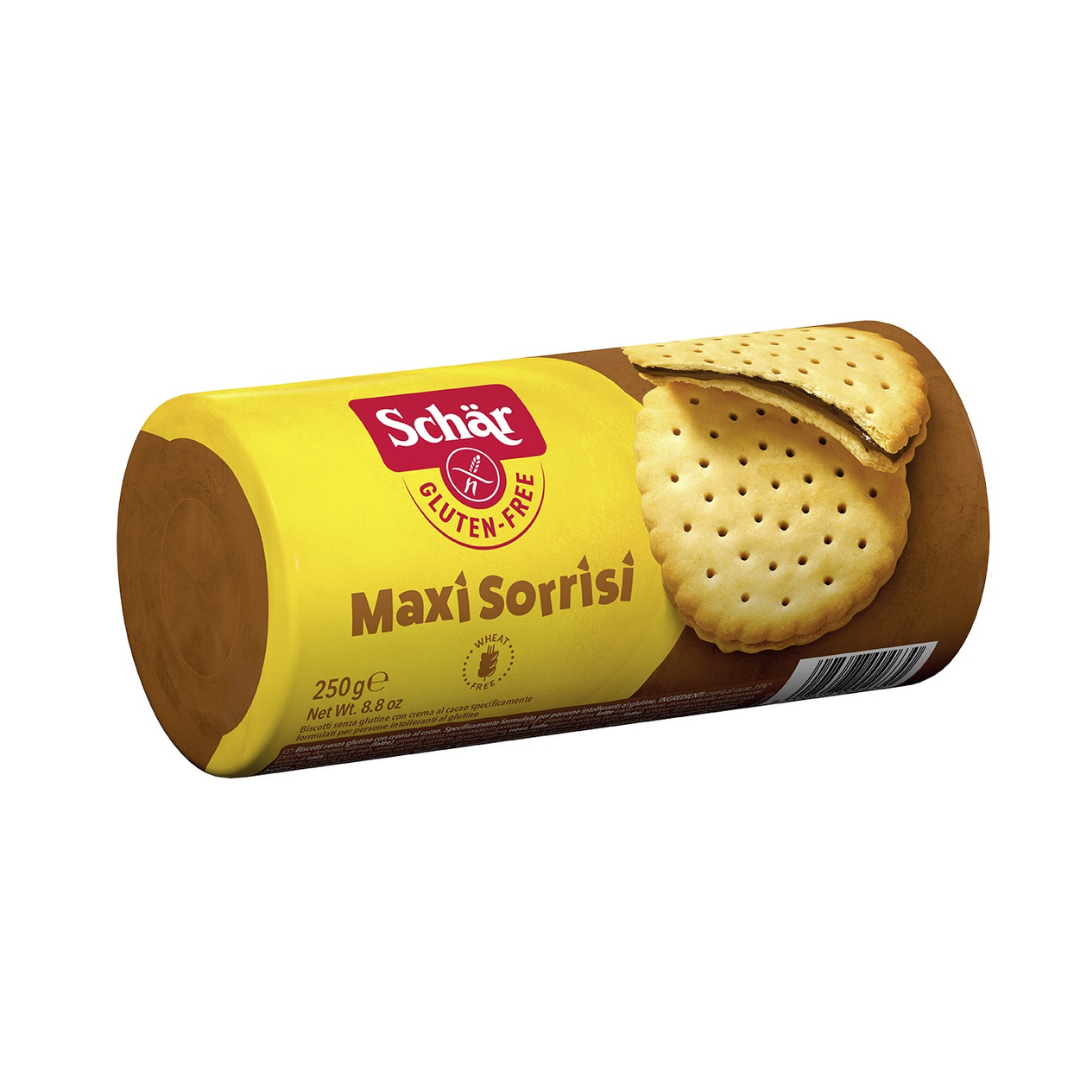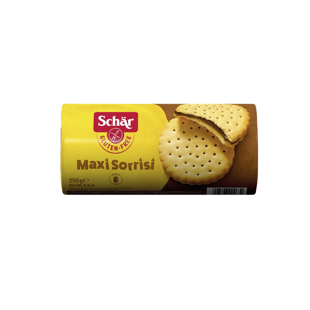 Schar Maxi Sorrisi Bisküvi iki yuvarlak bisküvi arasına sürülmüş kakaolu kremadan oluşan glutensiz sandviç bisküvi ürünüdür. Klasik kremalı bisküvi deneyimini buğday unu kullanmadan glutensiz un karışımıyla sunar. 250 g’lık paketi evde çay saati, misafir ikramı veya ofiste paylaşmalık tatlı atıştırmalık olarak kullanılabilecek çoklu tüketim için tasarlanmıştır.