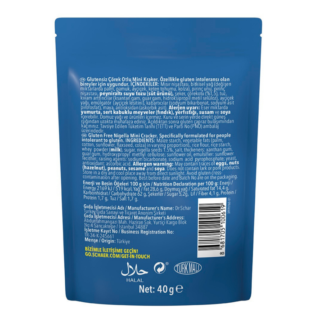 Schar Nigotti Çörek Otlu Kraker çörek otunun karakteristik aromasıyla zenginleştirilmiş kıtır dokulu glutensiz mini krakerlerden oluşan tuzlu bir atıştırmalıktır. Mısır nişastası ve pirinç bazlı içeriği sayesinde buğday unu kullanılmadan üretilir. Tek paketlik küçük gramajı gün içinde çantada, ofiste veya okulda taşınabilen pratik bir ara öğün seçeneği haline getirir. Çörekotlu hafif tuzlu lezzetiyle klasik kraker deneyimini glutensiz formda sunar.