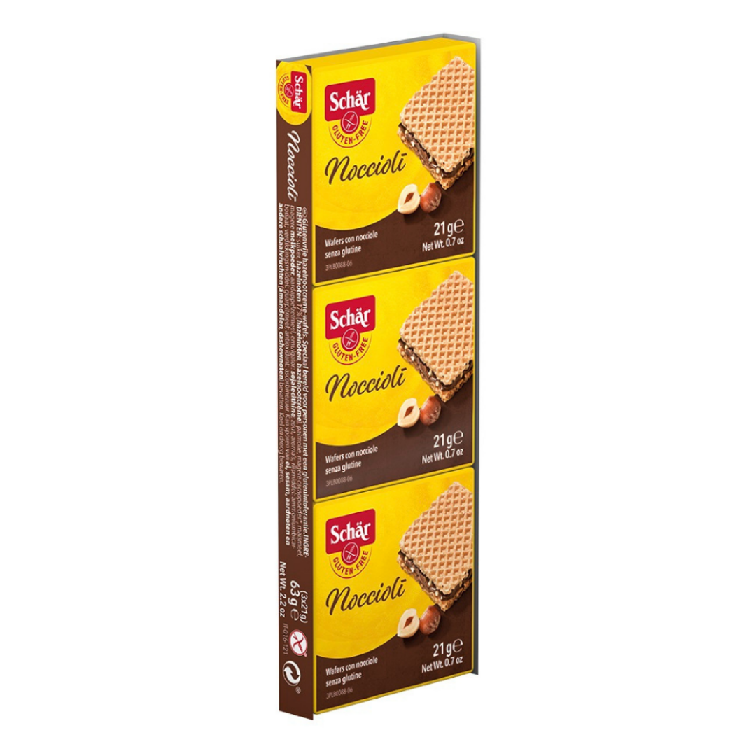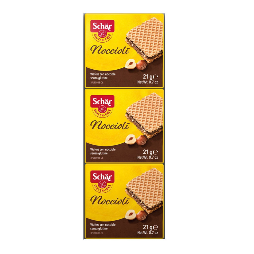 Schar Noccioli Kremalı Fındıklı Gofret iki çıtır gofret katmanı arasında fındık parçacıkları ve kakaoyla zenginleştirilmiş glutensiz kare gofretlerden oluşan bir atıştırmalıktır. Fındık oranının yüksek olması ürünün aromatik yapısını güçlendirirken süt tozu içeriği klasik sütlü çikolata benzeri bir tat profili oluşturur. 3x21 g’lık paket yapısı günlük hayatta pratik bir seçenek sunar.