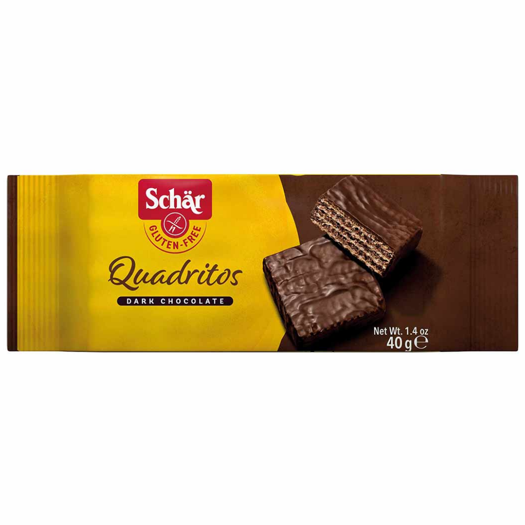 Schar Quadritos Gofret ince katmanlı kakaolu gofret yapraklarının arası krema ile doldurulup dışı bitter çikolata ile kaplanmış kare bir gofrettir. Schar ürünü glutensiz, buğdaysız, yumurtasız ve koruyucu içermeyen bir çikolatalı gofret seçeneği olarak tasarlanmıştır. Paket formatı da yanınızda taşımaya uygun pratikliktedir.