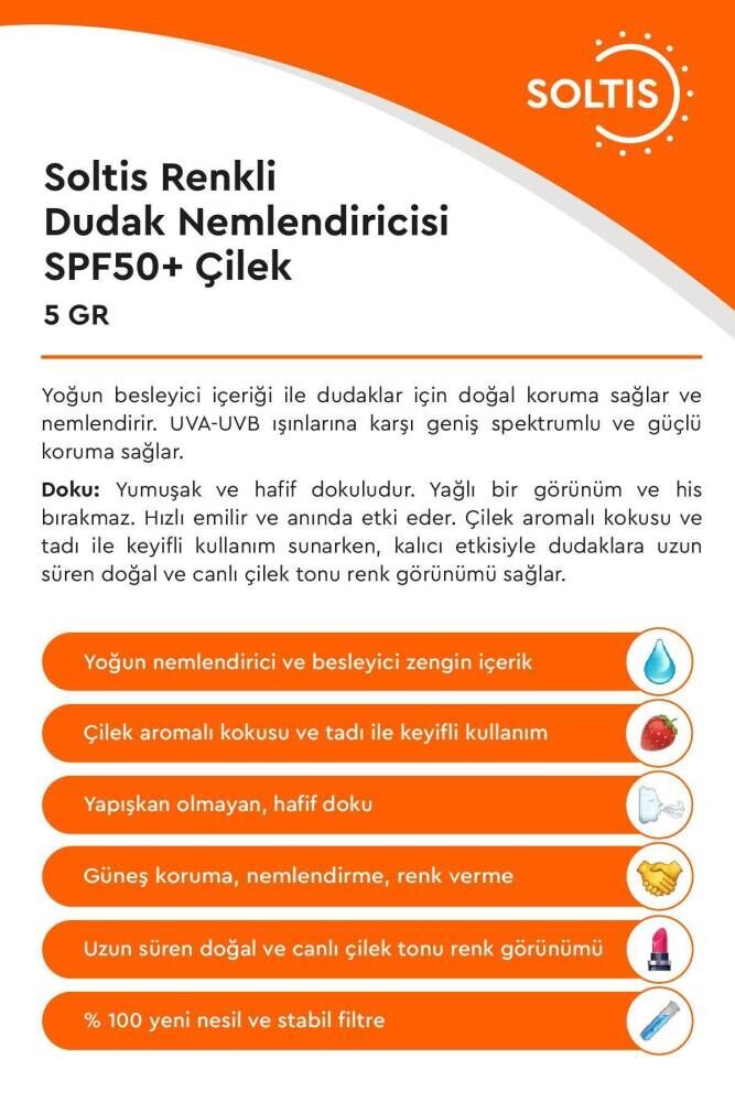 Yoğun besleyici içeriği ile dudaklar için doğal koruma sağlar ve nemlendirir; UVA; UVB ışınlarına karşı geniş spektrumlu ve güçlü koruma sağlar; Doku:Yumuşak ve hafif dokuludur; Yağlı bir görünüm ve his bırakmaz; Hızlı emilir ve anında etki eder; Çilek aromalı kokusu ve tadı ile keyifli kullanım sunarken, kalıcı etkisiyle dudaklara uzun süren doğal ve canlı çilek tonu renk görünümü sağlar; Avantajlar: Mineral yağ, gluten, parfüm, paraben, alkol, silikon içermez; Kullanım şekli:Dudak üzerine bastırarak uygulayınız, ihtiyaç halinde tekrarlayınız; Öne Çıkan Bitkisel İçerikler: Shea Yağı:Yüksek oranda A ve E vitaminleri sayesinde çok etkili nemlendirme sağlar ve sıradışı iyileştirici yetenekleri sebebi ile cilt bakımlarında tercih edilir; Hindistancevizi Yağı:Yüksek oranda E vitamini içeriği ile cildin gelişimi ve serbest radikal hasarlarının tamirine yardımcı olur; Aynı zamanda cildi pürüzsüz hale gelmesi için çalışır ve çatlamalara karşı bakım sağlar; Efektif ve uzun süre kalıcı nemlendirme sağlar; Vitamin E: Antioksidan etki göstererek cildin serbest radikallere karşı direncini arttırır; Cildi iyileştirici ve çok iyi nemlendiricidir; Hasar görmüş cildin tamiri için çalışır; Oluşmuş veya oluşabilecek çatlaklara karşı mücadele eder; İçindekiler/Ingredients:Helianthus Annuus Seed Oil, Cera Alba, Cocos Nucifera Oil, Ethylhexyl Triazone, Coco; Caprylate/Caprate, Copernicia Cerifera Cera, Bis; Ethylhexyloxyphenol Methoxyphenyl Triazine, Diethylamino Hydroxybenzoyl Hexyl Benzoate, Butyrospermum Parkii Butter, Aroma (Strawberry), CI 19140, CI 45410, Tocopheryl Acetate %100 doğal içeriklidir;